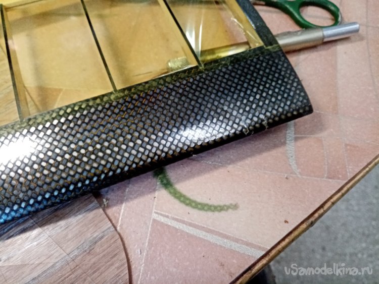 Выкраиваю кусочек нужного размера и при помощи простого домашнего утюга оклеиваю руль направления. Подтягивать пленку можно и на паяльном термофене. Установленном на температуру в 160 градусов.