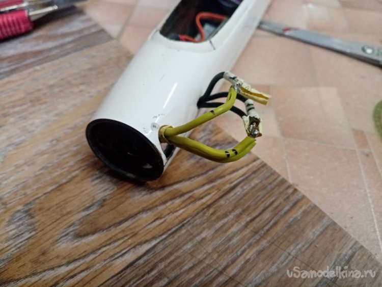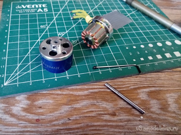 Для этой процедуры нужно извлечь мотор из носовой части фюзеляжа. Оказалось не простая задача. Как уже говорил, все отличные модели изготовлены на пределе установки оборудования. Поэтому они такие прочные, легкие и хорошо летят. Откручиваю винты крепления двигателя к мотораме. Вал его установлен как у всех планеров наоборот. С предосторожностями извлекаю провода, идущие внутрь корпуса к регулятору. Распаиваю соединения не забыв отметить расположение проводов. Иначе при ошибке винт будет крутиться в другую стороны. Наконец трудности предельной компоновки преодолены и мотор извлечен. Откручиваю винты фиксации вала и извлекаю его.