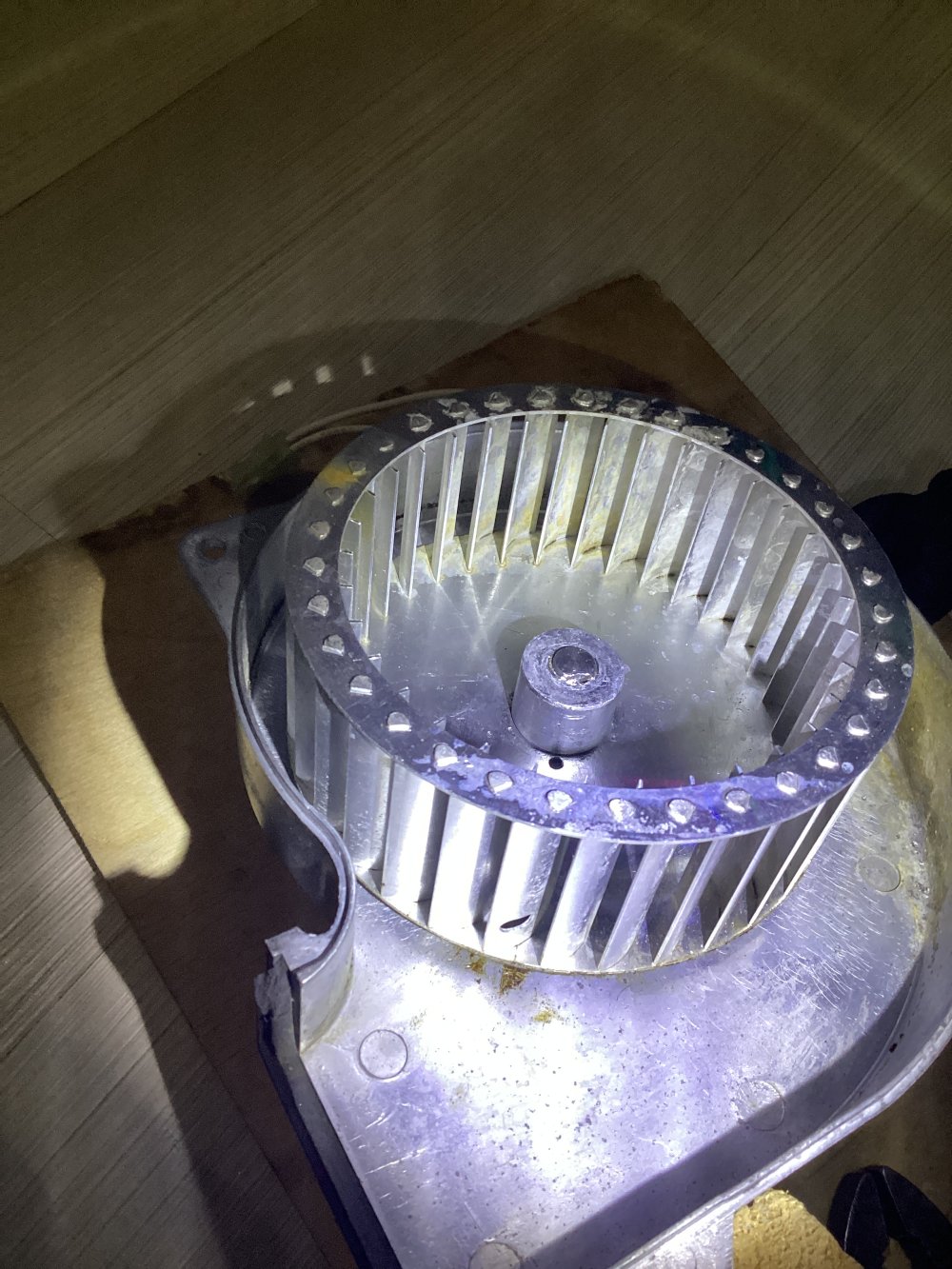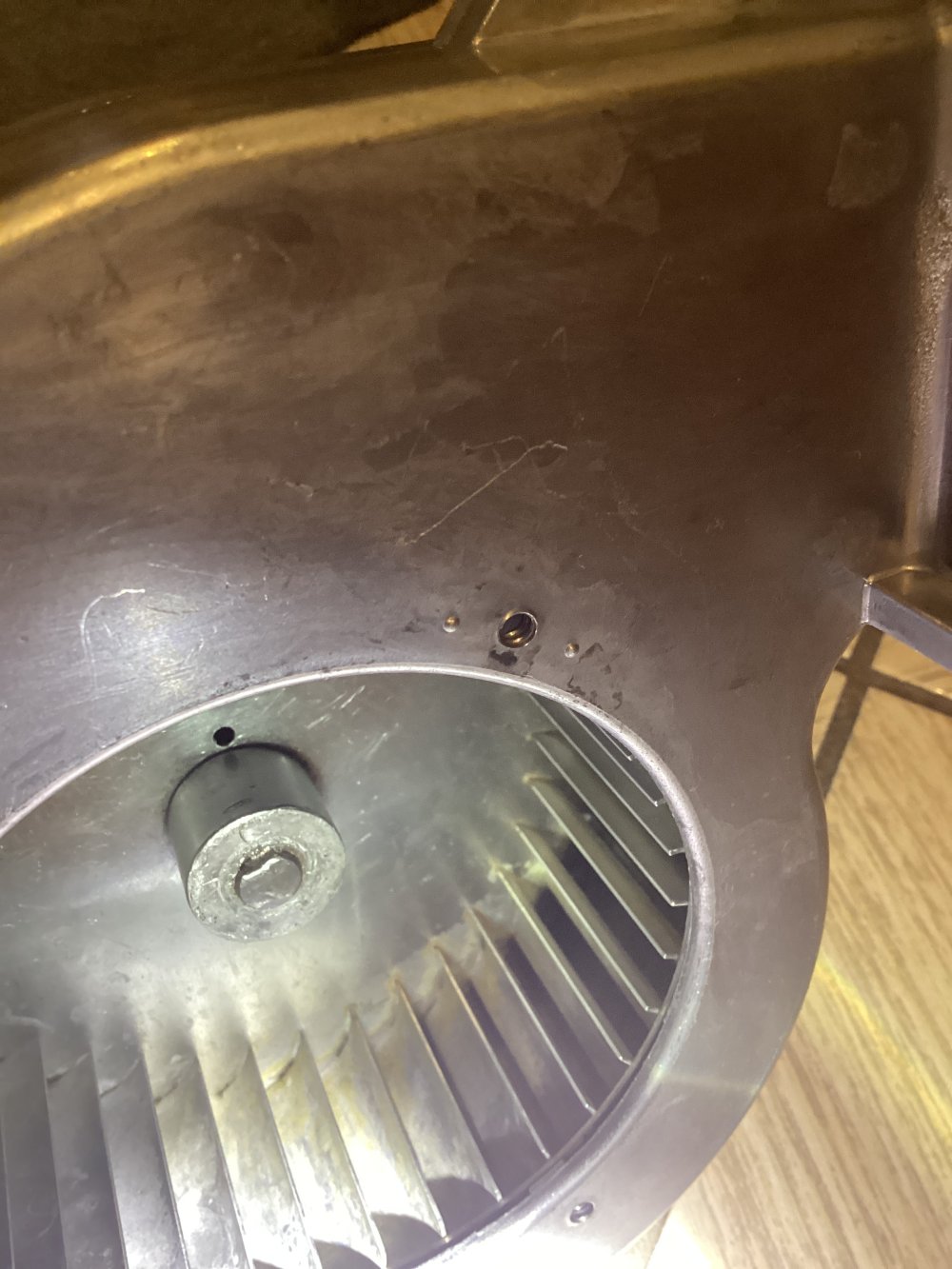 Сам ротор в тисках зажимать не рискнул во избежание деформации. До зазора между корпусом и крыльчаткой изнутри очень сложно добраться, выходной воздушный канал изогнутой формы, получается расклинивать только с одной стороны вала. Но от этого никакого толку.🤷‍♂️