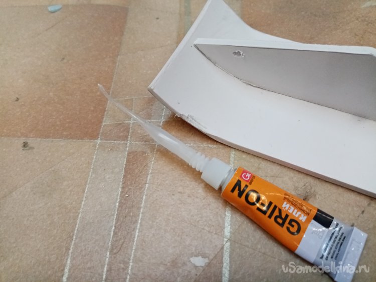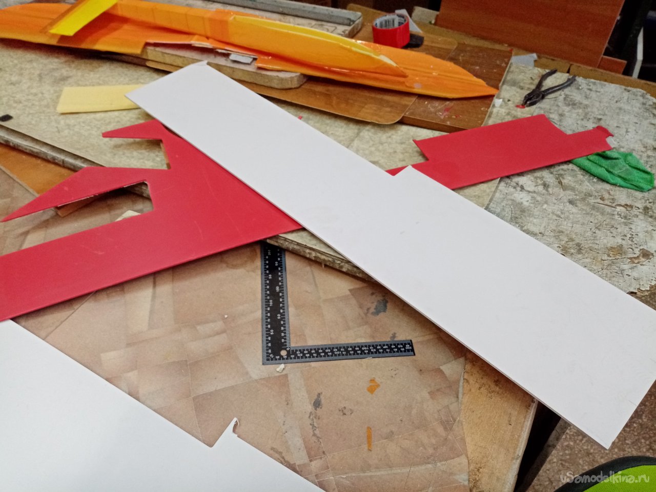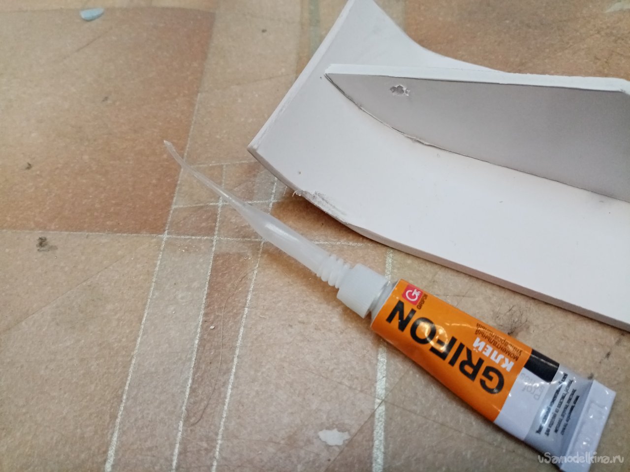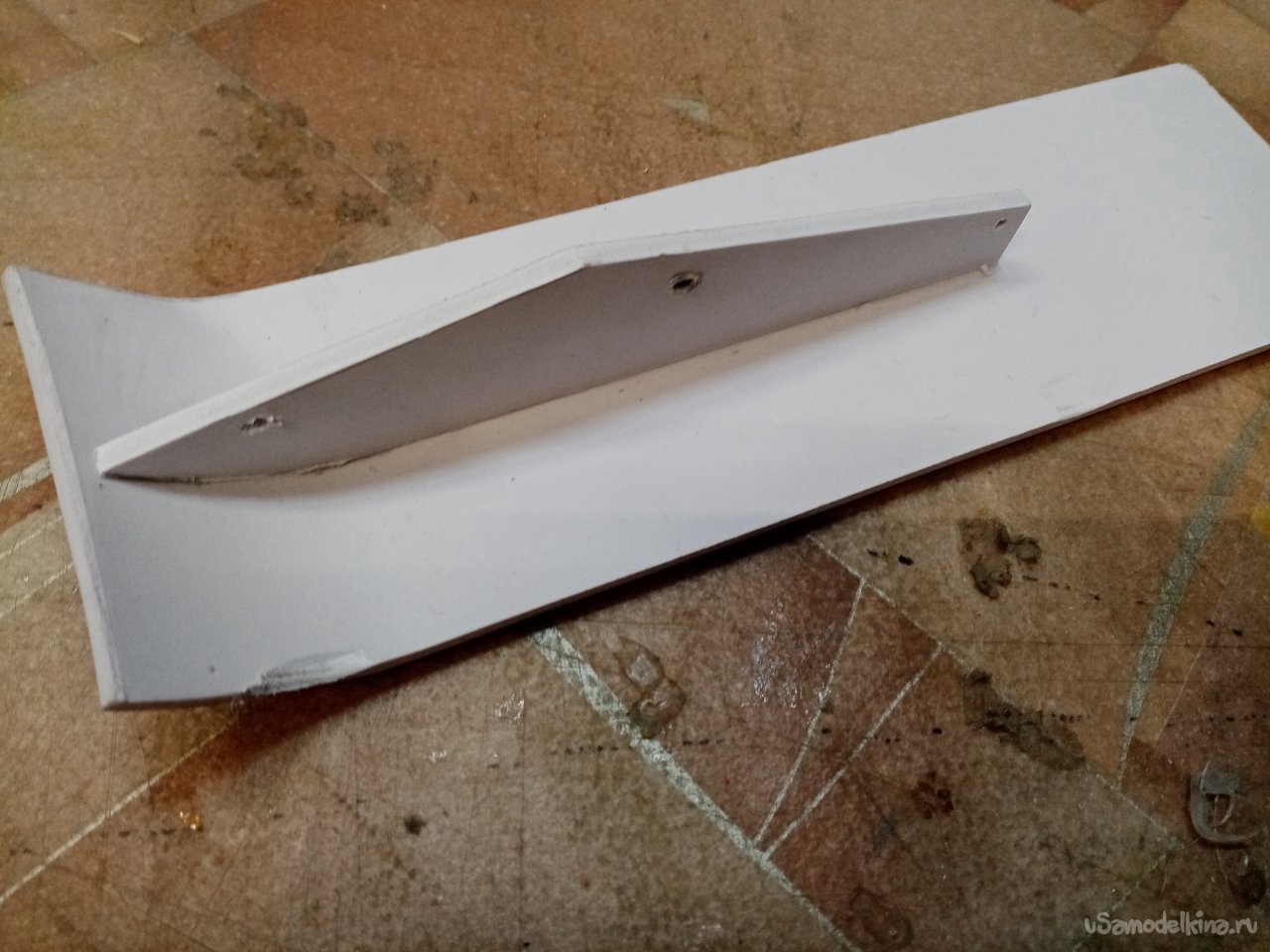Предварительно разметив материал, продолжаю работы. Из более толстого пластика вырезаю вертикальные пластины крепления. Сразу просверливаю отверстия для установки оттяжек. Они будут фиксировать лыжи в полете в определенном положении. Нужно приклеить детали. Прикладываю вертикальную пластину к подошве и капаю несколько капель циакрина для закрепления.