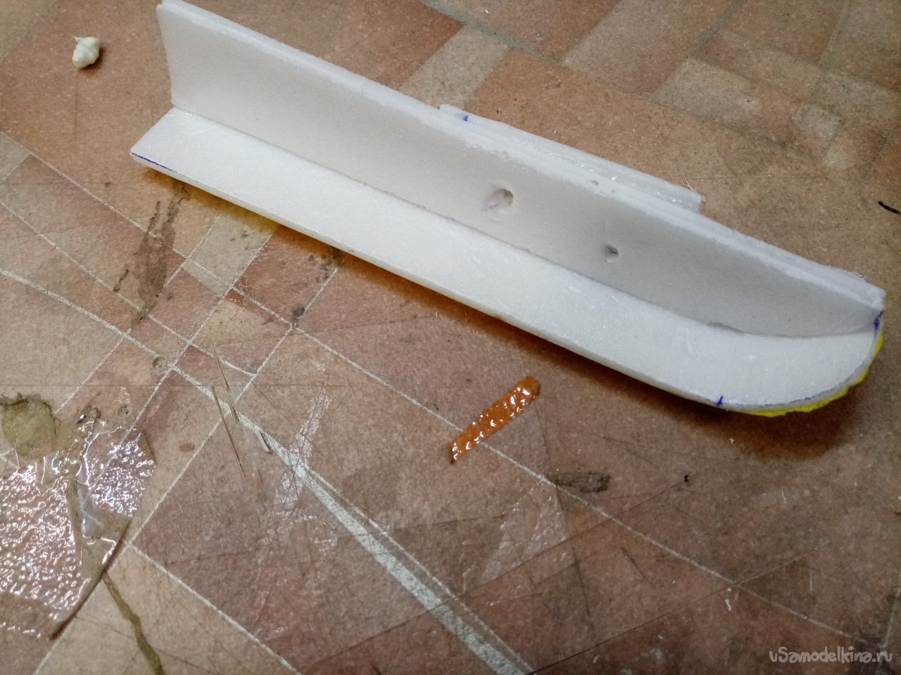 Наш ученик изготовил самолет. И в преддверии зимы поставил его на лыжи. Но не задалось. Изготовленное приспособление не выдержало практического применения. Размер оказался маловат и модель проваливалась в рыхлый снег. Материал так же оказался жидковат. Не удивительно, конструкция изготовлена из пенопласта. После консультации, решили переделать все.