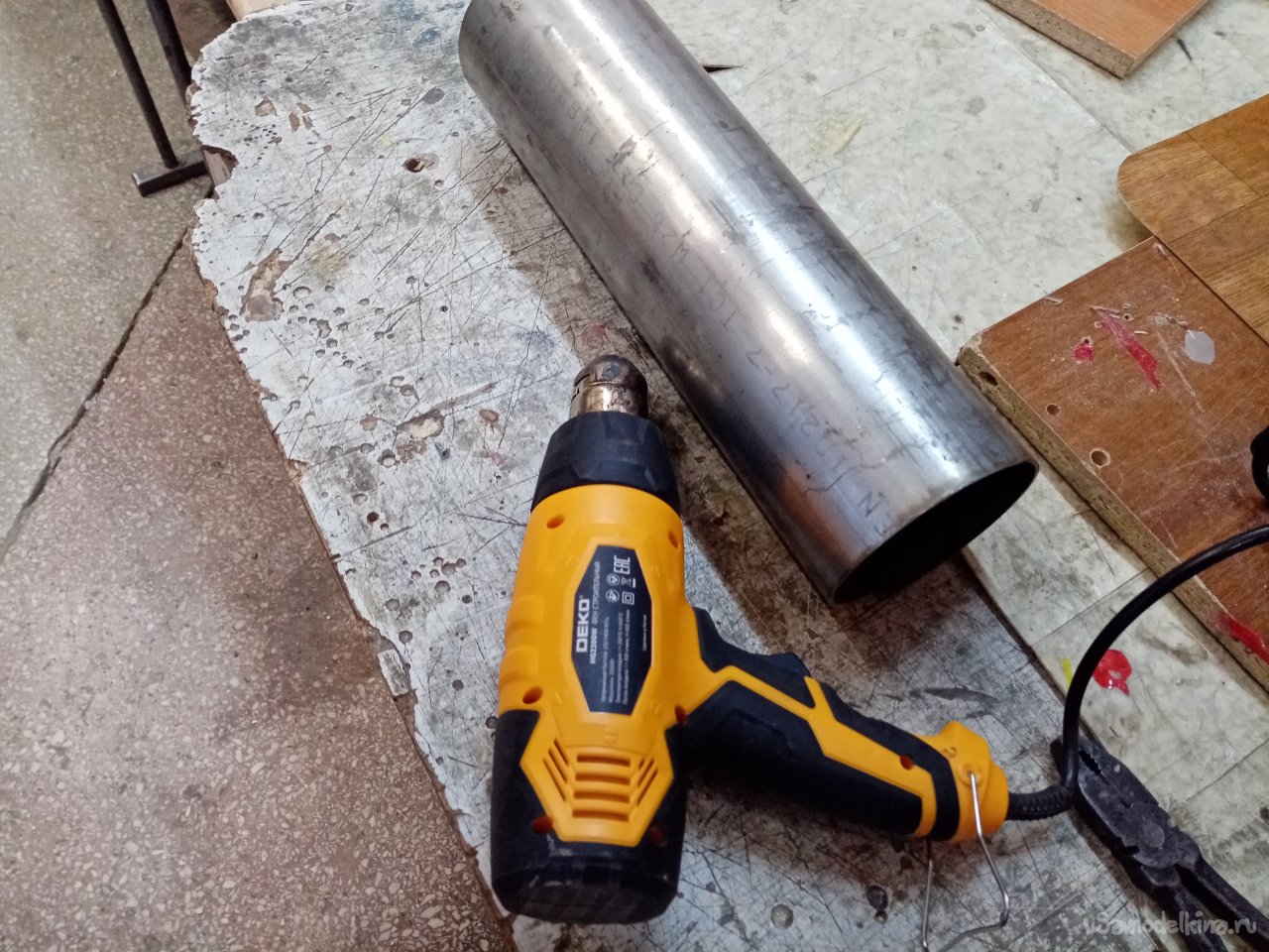 Для начала нужно загнуть носики заготовок. Процедура достаточно простая. Разогреваю пластик при помощи строительного термопистолета. Стараюсь не перегреть. В качестве защиты рук при работе с горячими изделиями применяю кожаные перчатки. Разогретый материал загибаю на металлической трубе, достаточно большого диаметра.