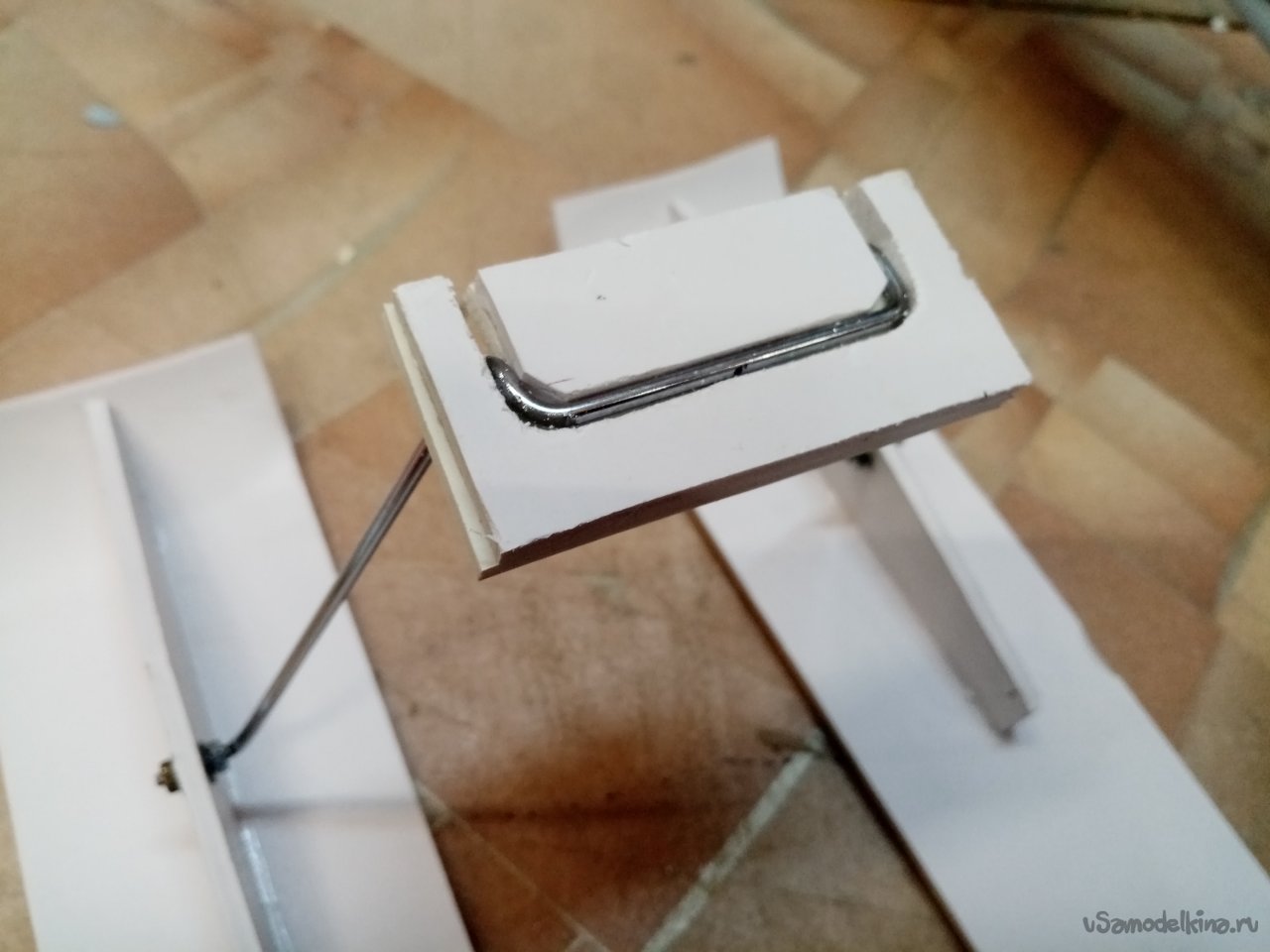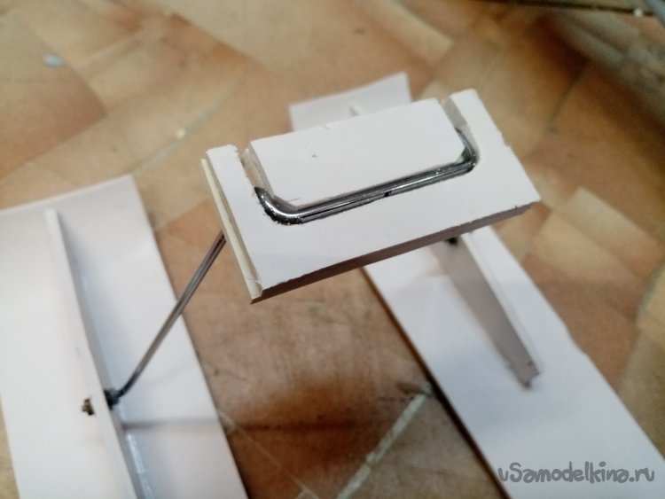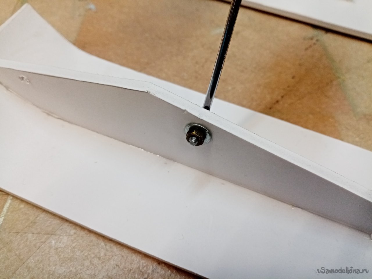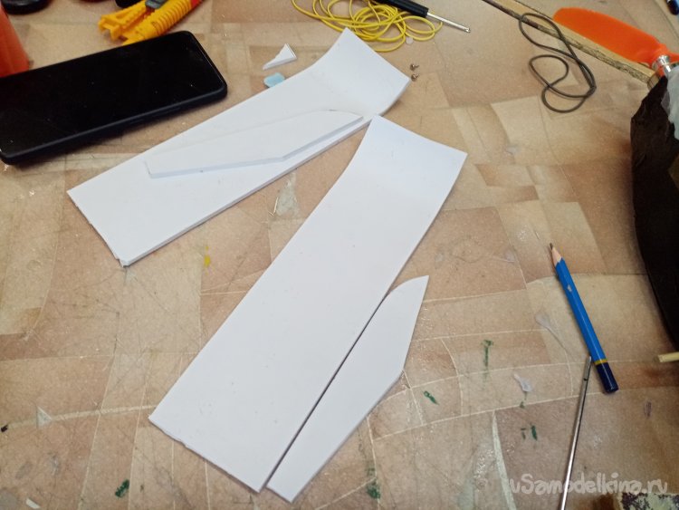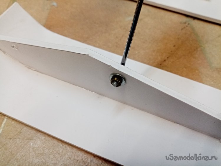 Для начала выбрали более прочный материал, а конкретно, рекламный пластик. На подошвы лыж пошел достаточно легкий материал в 2,5 мм. На крепления лыж в 3 мм. Площадь поверхности также увеличили практически в два раза. У нас в моделке есть немного белого рекламного пластика. Подарок фирмы.