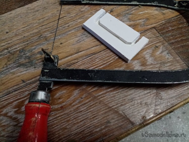По разметке выпиливаю паз под стойку. Операция простая выполняется при помощи моего модернизированного лобзика.