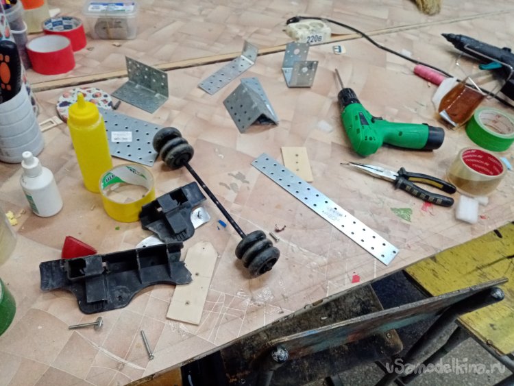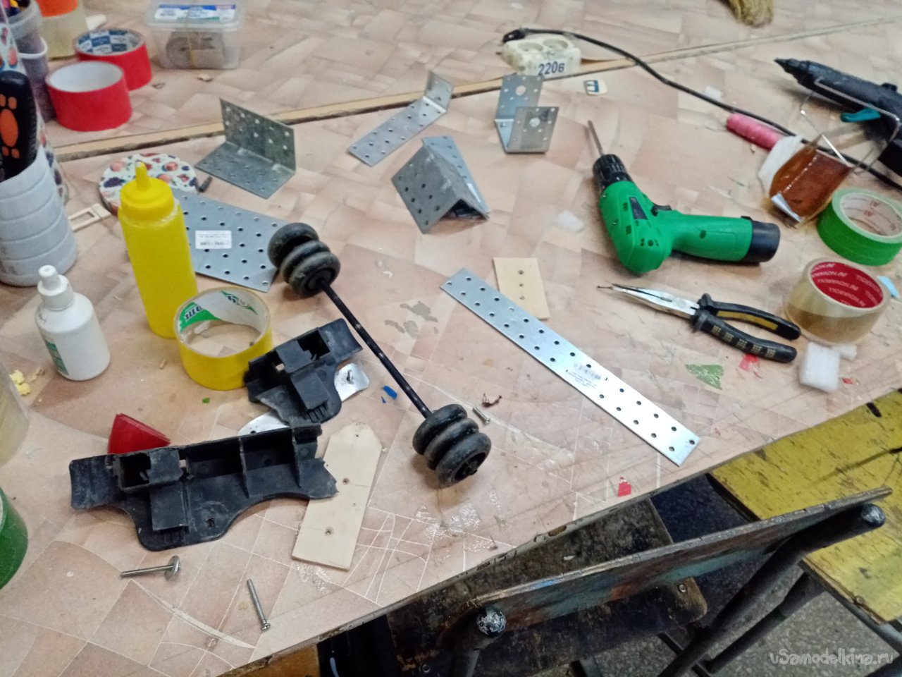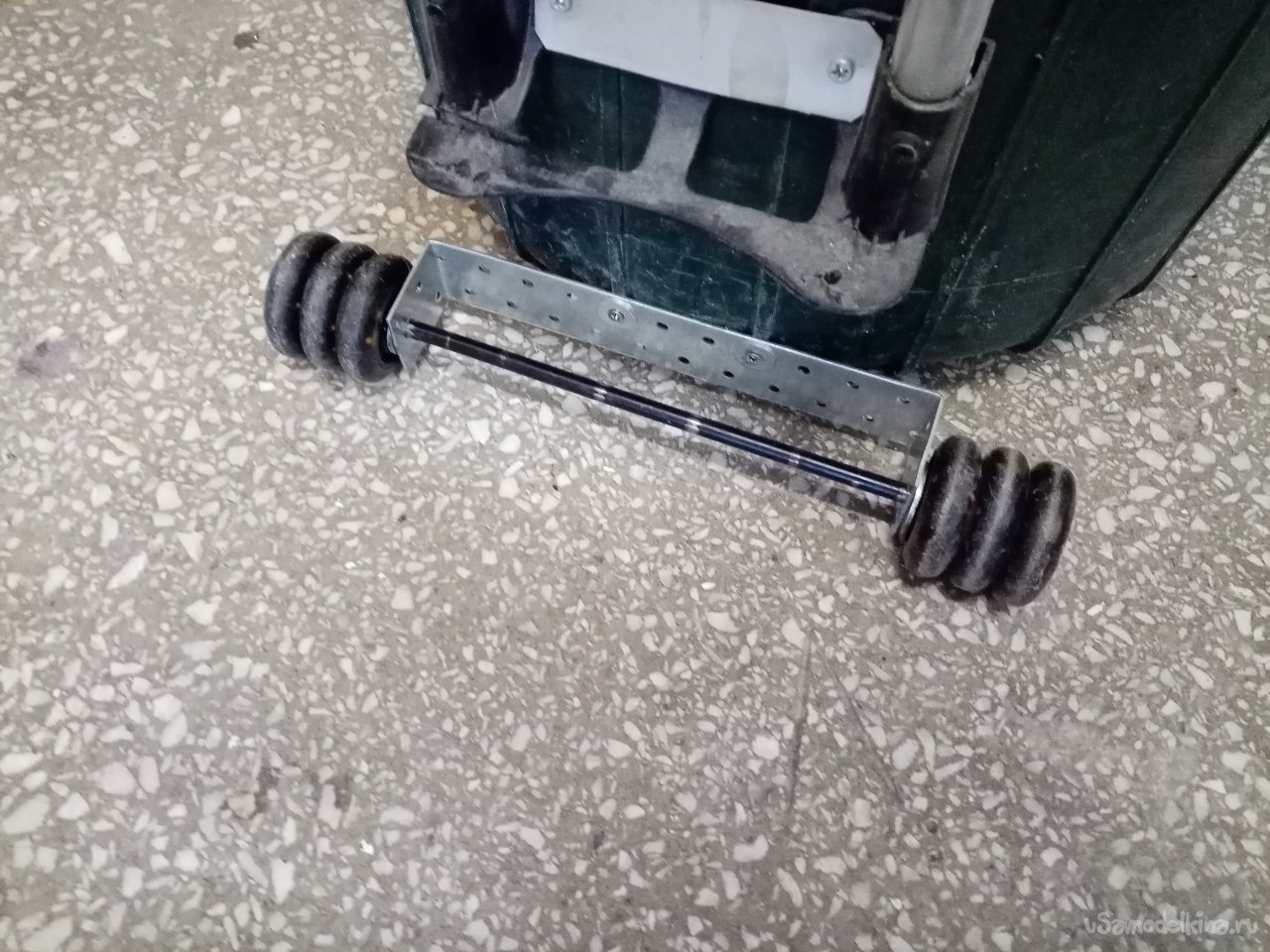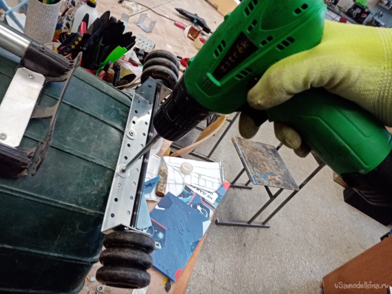 Шасси готово. Соединяю с мусорным баком. Стараюсь работать по быстрее. Товарищи не покладая рук и веников уже нагреби ненужного хлама на пару заездов к месту вбрасывания.