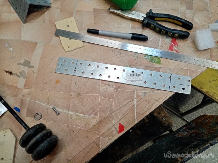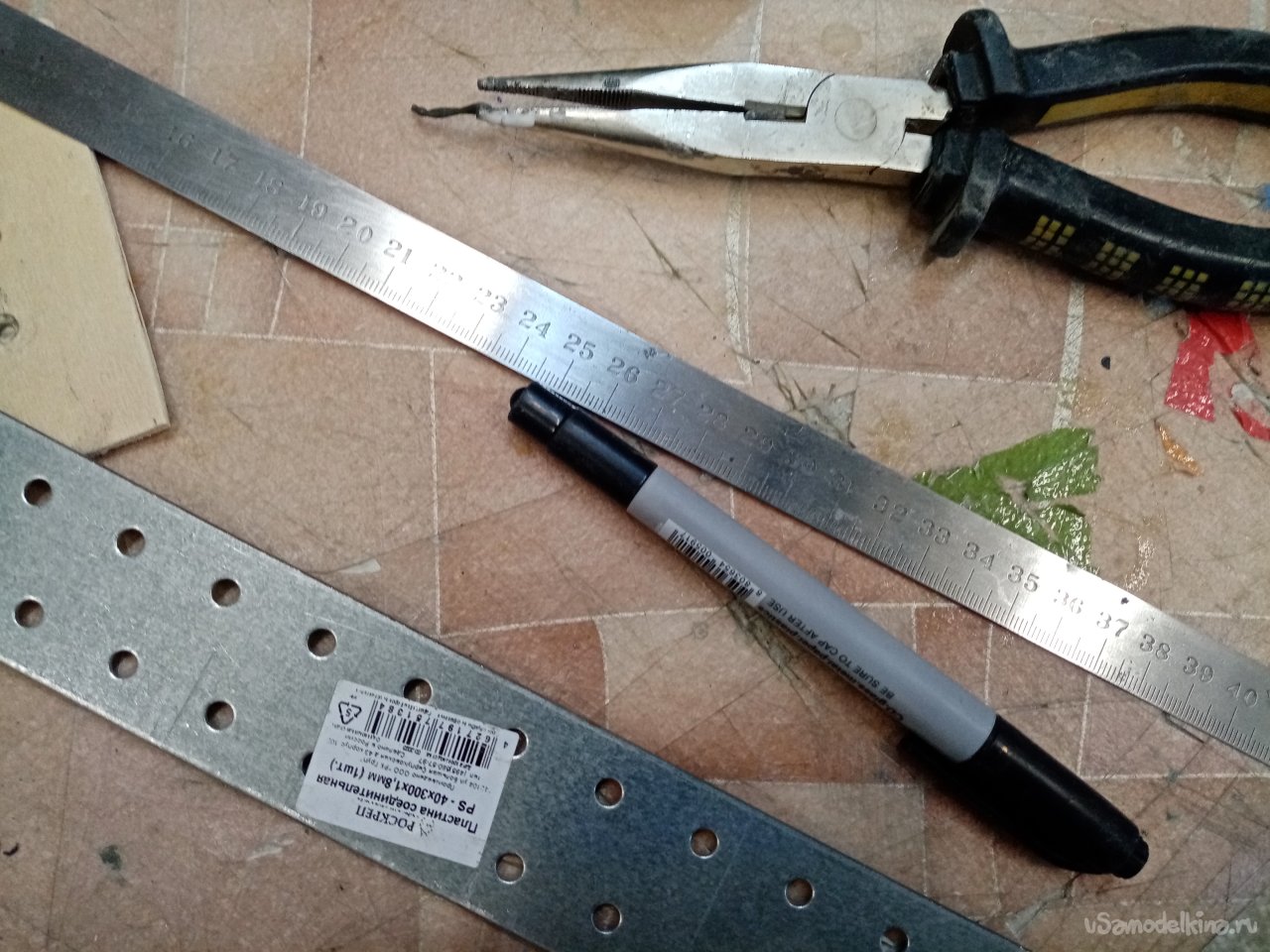 Остались еще некоторые металлические части от мощной катапульты. Которую мы соорудили год назад. Их коробочки с хламом извлекаю очень даже неплохую перфорированную полосу оцинкованного металла. Промеряю размеры. Создается впечатление, заготовки хватит на исполнение проекта. При помощи линейки и фломастера размечаю места перегиба и прохождения оси.