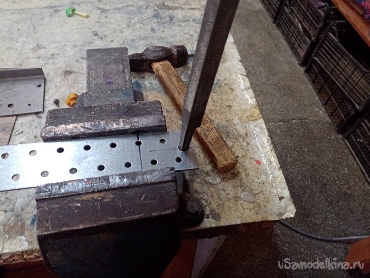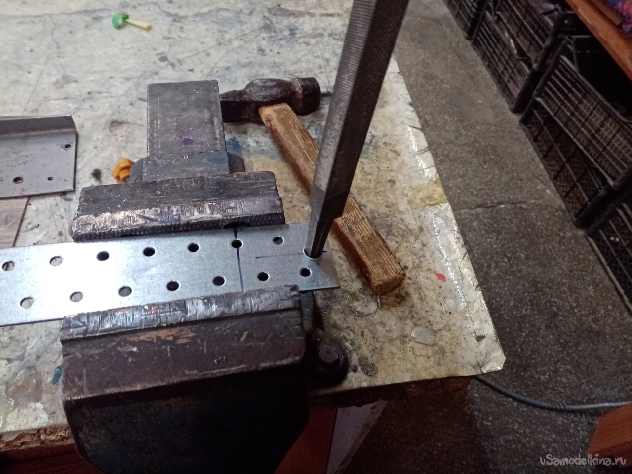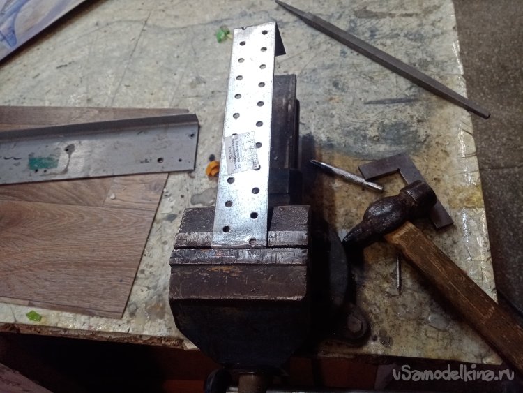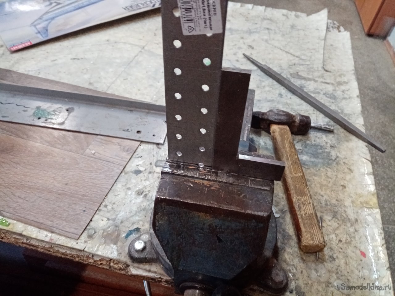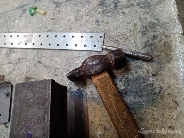 Нужно сгибать и сверлить. Первое действие, замеряю диаметр оси. Нужно разметить положение отверстий и накернить места под сверление.