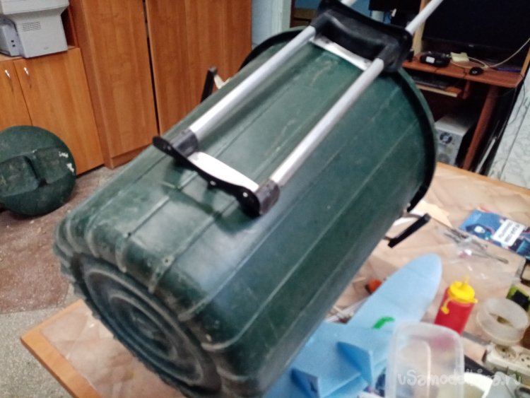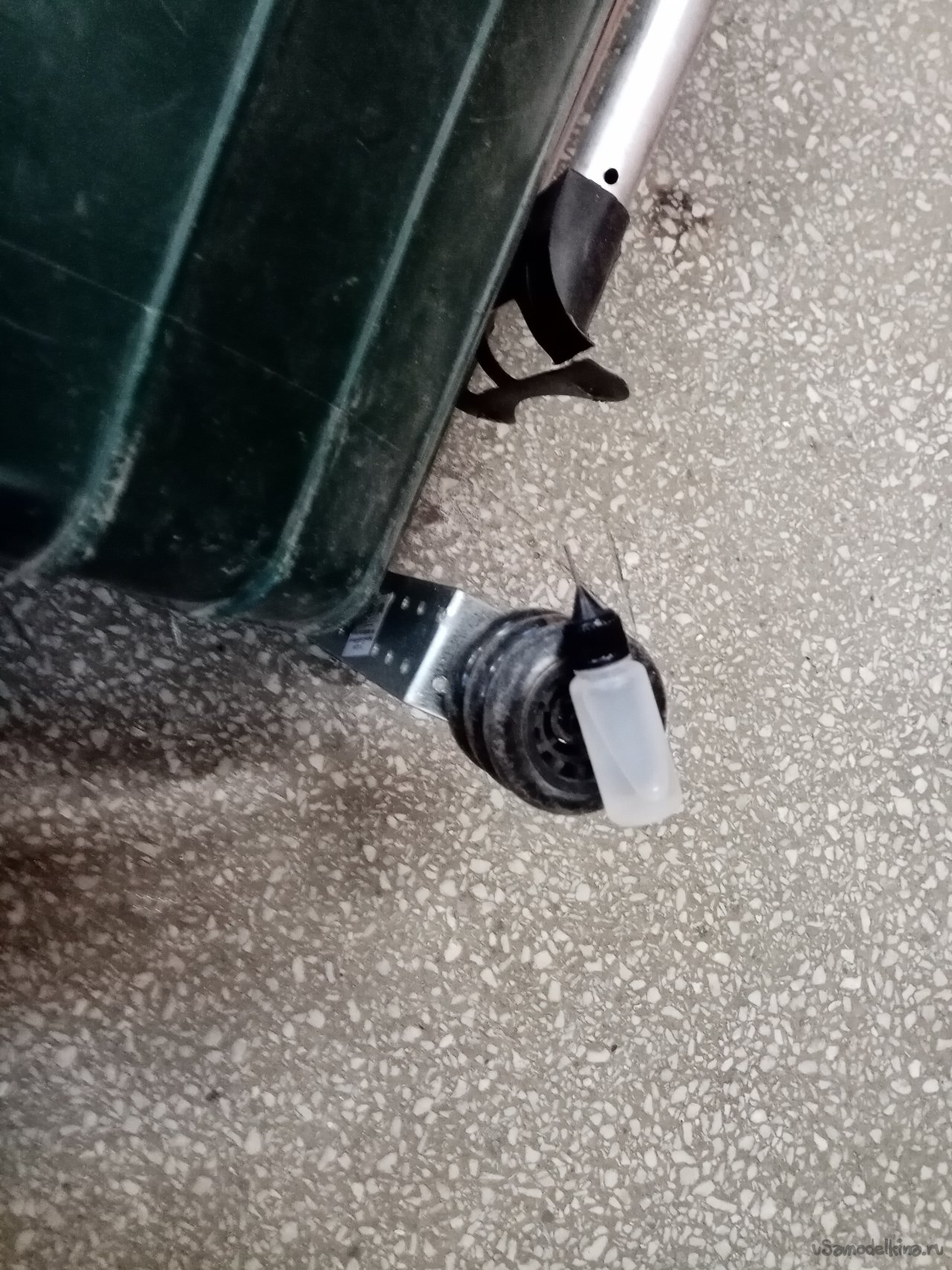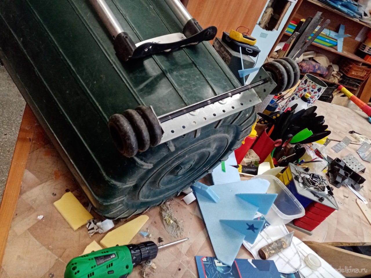 И вот в этом напряженном транспортном трафике возникла неожиданная задержка. Сломалось шасси мусорного бака. Которое я некоторое время назад собрал из двух туристических сумок. Из одного выброшенного комплекта изъято было само шасси. Из другого чемодана складывающаяся ручка.
