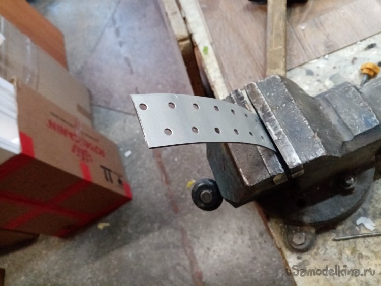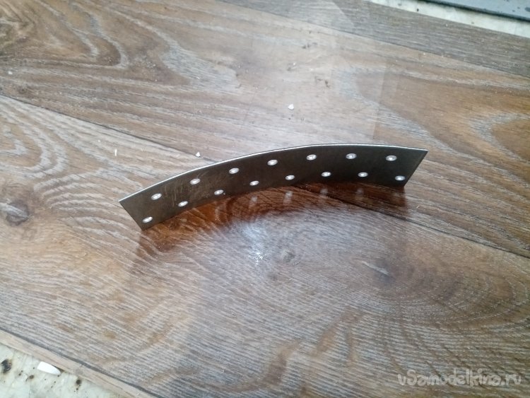 С внутренней стороны нужно проложить еще одну полосу металла. Пластик бака нужно укрепить в месте соединения с колесами. Нашлась еще одна перфорированная оцинкованная пластина. Изгибаю её в тисках по внутреннему диаметру.