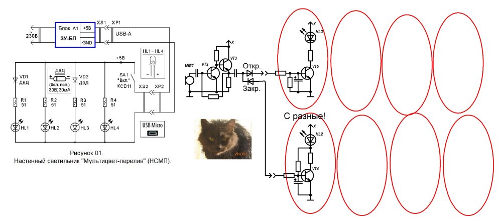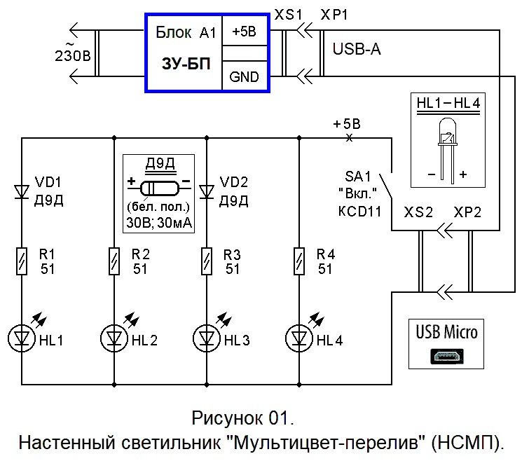 Светильник НСМП является простейшим, но эффектным устройством, создающим праздничную атмосферу в помещении. Стабилизированным напряжением +5 Вольт питаются четыре параллельно включённые цепочки, в состав которых входят переливающиеся LED с 4 токоограничительными резисторами R1 … R4. Последовательно с нечётными цепочками включены выпрямительные диоды VD1 и VD2. Германиевые диоды имеют прямое падение напряжения порядка 0,1 … 0,2 Вольта. Именно на такую величину уменьшено напряжение питания цепей HL1 R1 и HL3 R3. Сделано это для повышения разнообразия цветовой картины, формируемой всеми переливающимися светодиодами.