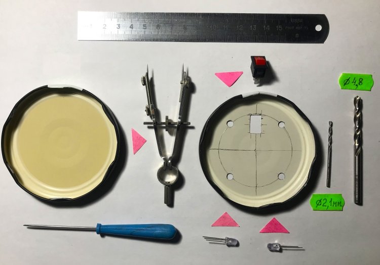 1). Моем и высушиваем или тщательно протираем крышку. 2). Острым шилом слегка намечаем центр крышки. 3). Берём из готовальни циркуль. Устанавливаем растр (расстояние между иголками) равный 37,5 мм. и прочерчиваем окружность с R = 37,5 мм. 4). В четырёх равноудалённых точках круга намечаем (под светодиоды) и сверлим отверстия диаметром 4,7 мм. Для получения большей точности местоположения отверстий, отверстия делают в 2 этапа: сначала сверлом меньшего диаметра. В случае отклонения от центра отверстия, нужный диаметр доводят круглым надфилем. 5). В верхней части крышки вырезаем прямоугольный паз (под SA1) высотой 13,5 мм и шириной 8,2 мм. Высота паза (13,5 мм) должна соблюстись строго. Иначе SA1 может зафиксироваться (защёлкнуться) в корпусе недостаточно плотно. Прежде, чем защёлкнуть SA1 в корпус, контакты выключателя рекомендуется залудить.