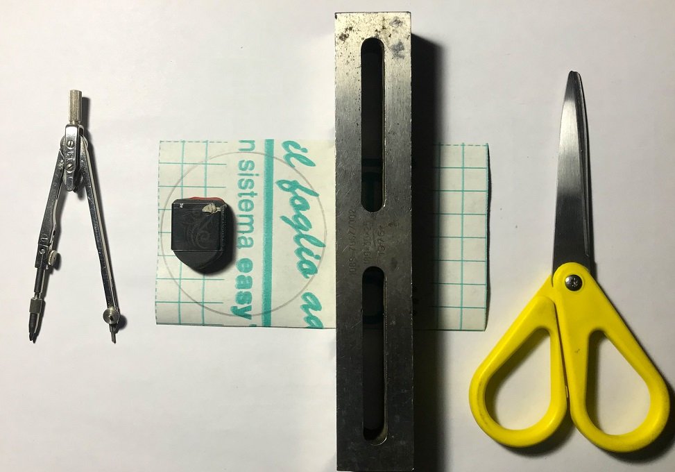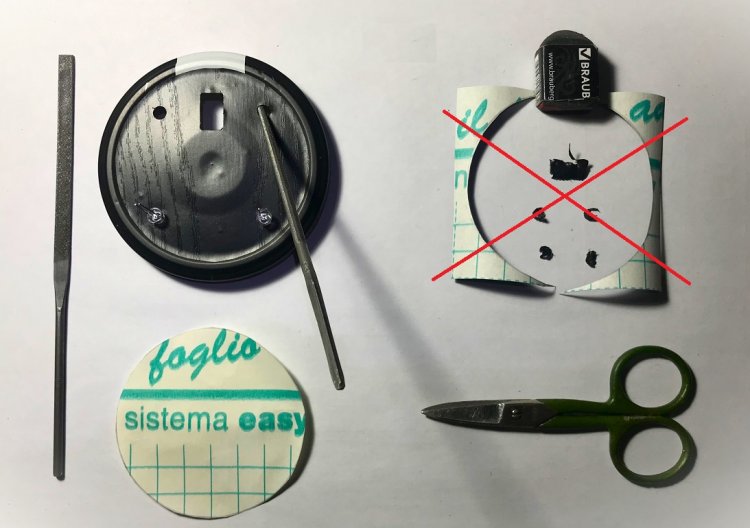 Для вырезания декоративного круга из самоклеящейся плёнки также можно воспользоваться циркулем. Устанавливаем R = 35 мм. Диаметр круга будет 70 мм. Круг сначала вырезается из заготовки и только непосредственно перед приклеиванием, с клеевой поверхности плёнки снимаем защитную бумагу.