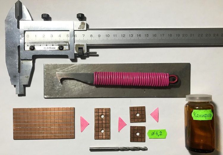 Изготовление одновременно нескольких плат, намного сокращает время их изготовления. Одна плата будет использована как макетная, а другая – для установки на дно верхней крышки. Третья часть – резервная, для макетирования других поделок. Размер всех разрезанных квадратных печатных площадок на плате составляет 5 х 5 мм.