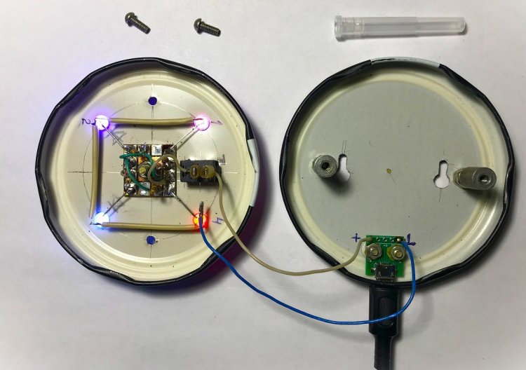 Монтаж проверен на отсутствие ошибок. Всё работает нормально. Для проверки эффекта «удлинения» светодиодов SF-LED, использовался колпачок от одноразовых шприцов. Результат: в этом что-то есть, но в случае с НСМП, особо не вдохновляет.