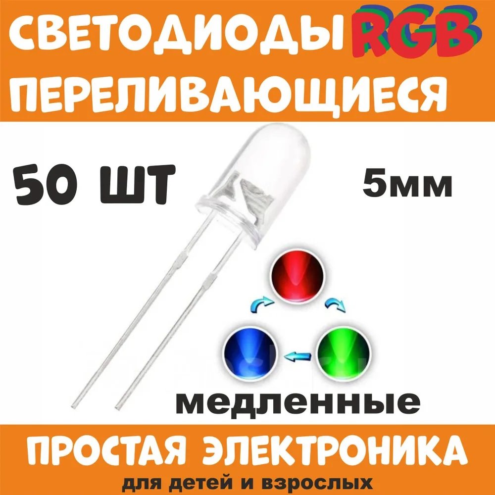 Светодиоды 5 мм, переливающиеся медленные 3В, 20 мА. Нужен резистор для +5 Вольт = 100 ... 200 Ом !!! Прямое напряжение 2,7В - 3,4 В - в зависимости от текущего цвета. Правда, после измерения потребляемого светодиодами тока, номинал токоограничительного резистора был выбран 51 Ом (при питании от +5 Вольт).