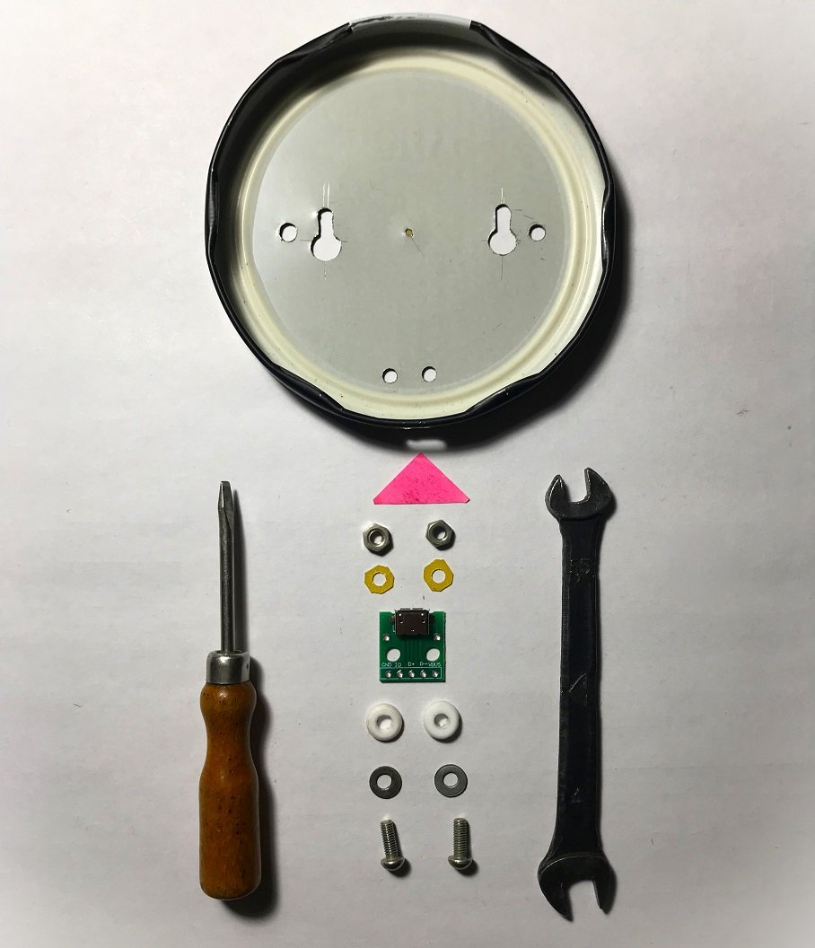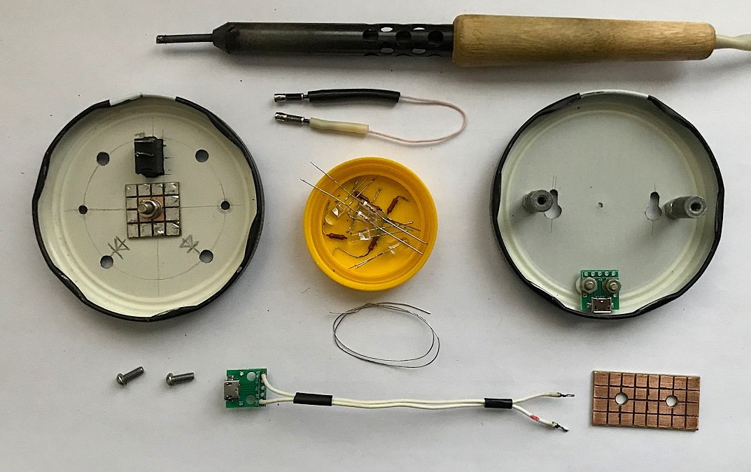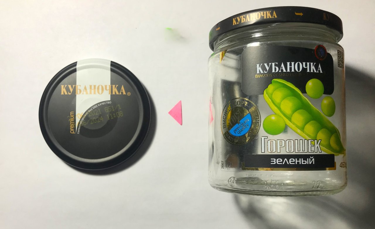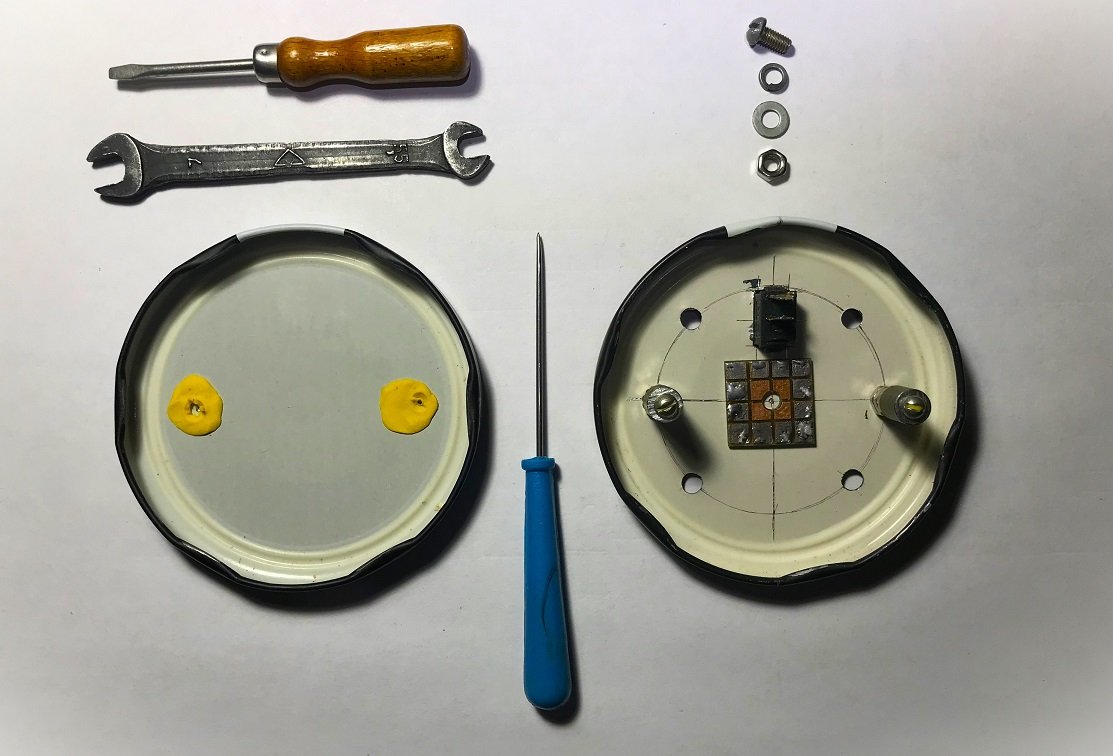 Освободив две стеклянные банки из-под зелёного горошка, крышки (диаметром 84 мм) можно использовать для изготовления корпуса НСМП.