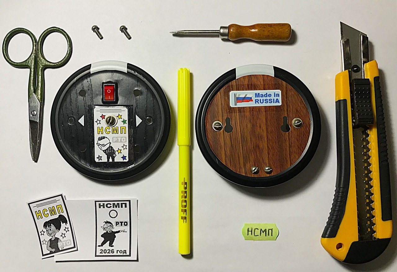 Так выглядят обе крышки корпуса НСМП, украшенные этикетками. Этикетки приклеиваются прозрачным скотчем. Два белых, вырезанных из белой изоленты, треугольника-стрелки указывают на винты, которые следует откручивать, если понадобится разбирать корпус НСМП. Если открутить два винта со стороны нижней крышки, могут рассыпаться импровизированные бонки (составленные из «низенького» полого цилиндра и дополнительных трёх гаек М4, предназначенных для наращивания высоты бонок). Чёрно-белые рисунки этикеток частично раскрашиваются фломастерами.