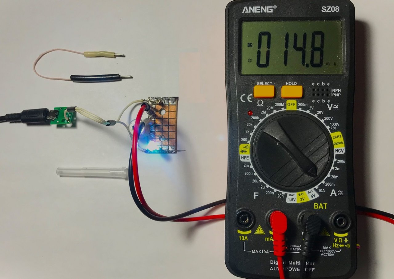 Между катодом VD1 и верхним выводом резистора R1 включался мультиметр «ANENG» SZ08 в режиме измерения постоянного тока (диапазон 200 мА) и при изменении сопротивления резистора R1 наблюдалось изменение рабочего тока HL1.