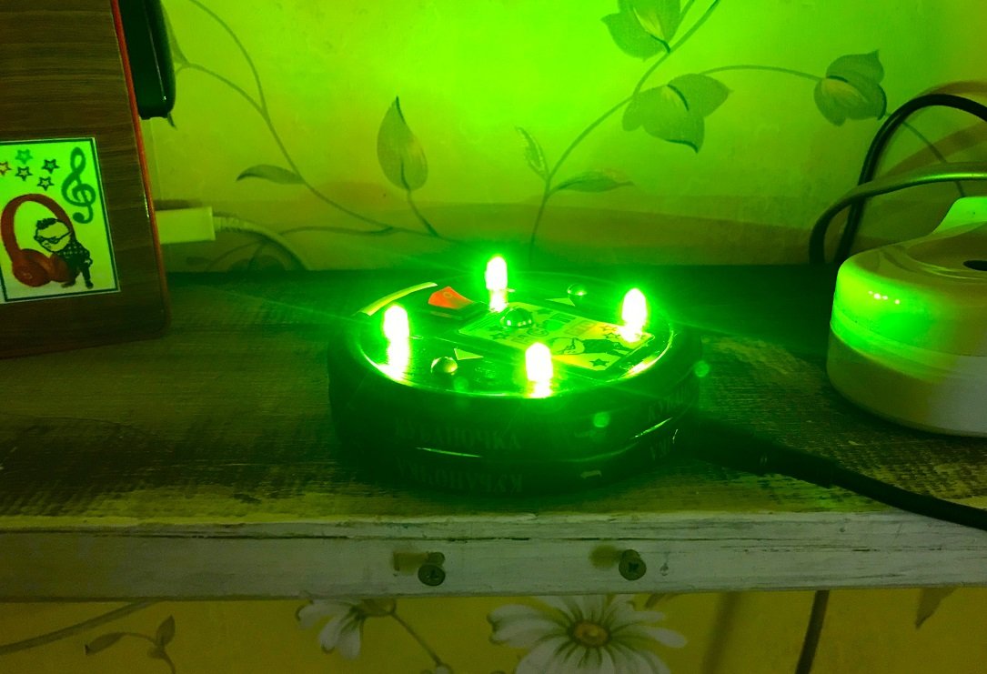 При включении питания все светодиоды загораются сначала красным цветом, затем зелёным, голубым … Через некоторое время периоды следования цветомузыкальных последовательностей нечётных пар (HL1 и HL3) переливающихся светодиодов начинают «отставать» от чётных пар (HL2 и HL4) и цветовая картина становится более разнообразной. (Все 4 LED работать одинаково скучно уже не будут).