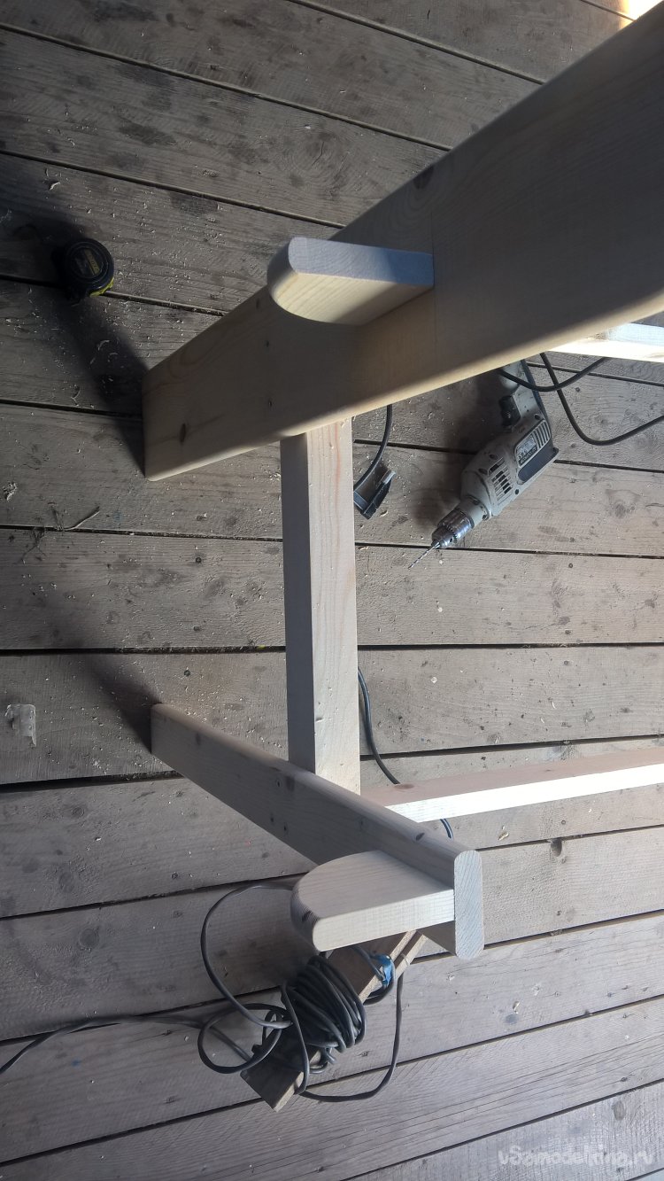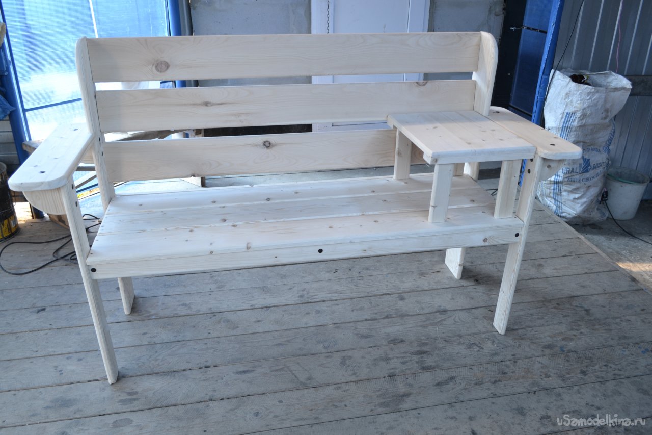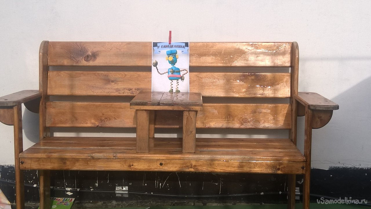 Подлокотники – это не только элемент комфорта, но и важная деталь, придающая скамейке завершенный вид. Два отрезка досок длиной 550 мм были закреплены на боковых частях каркаса, между передними и задними ножками. Я расположил их так, чтобы они переходили от передней части ножки к задней. Для надежности крепления я использовал мебельные шурупы, которые обеспечивают прочное соединение и эстетичный внешний вид. Затем пришла мысль сделать съёмный столик, в итоге получилась вот такая конструкция. Это небольшой, но продуманный элемент добавил скамейке ещё больше практичности, превратив её в идеальное место для чаепития или чтения на свежем воздухе. Размеры все примерные.