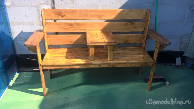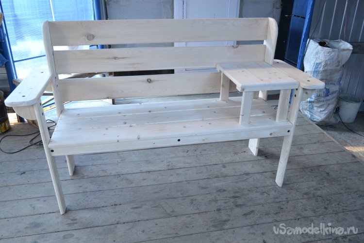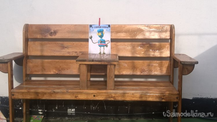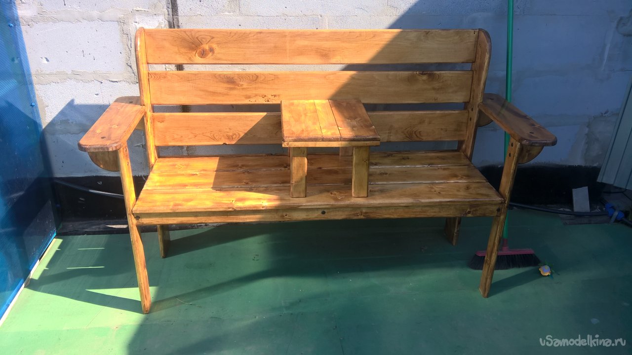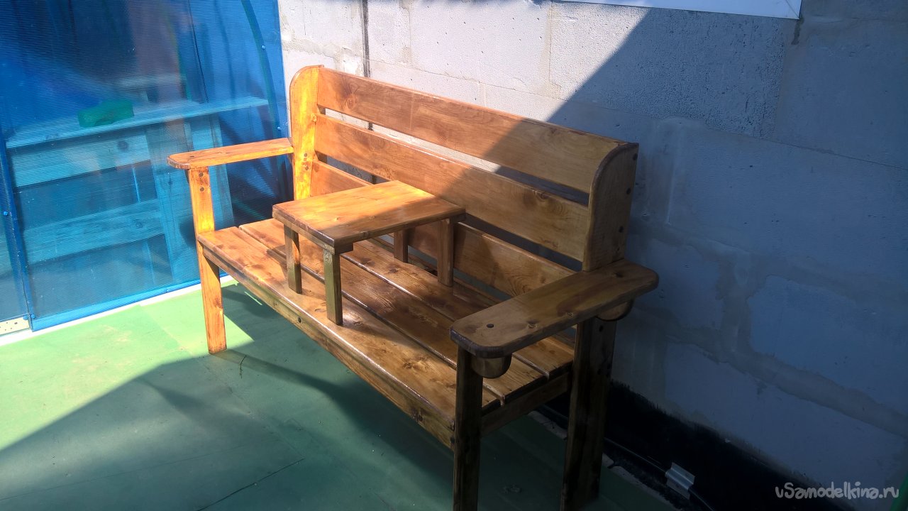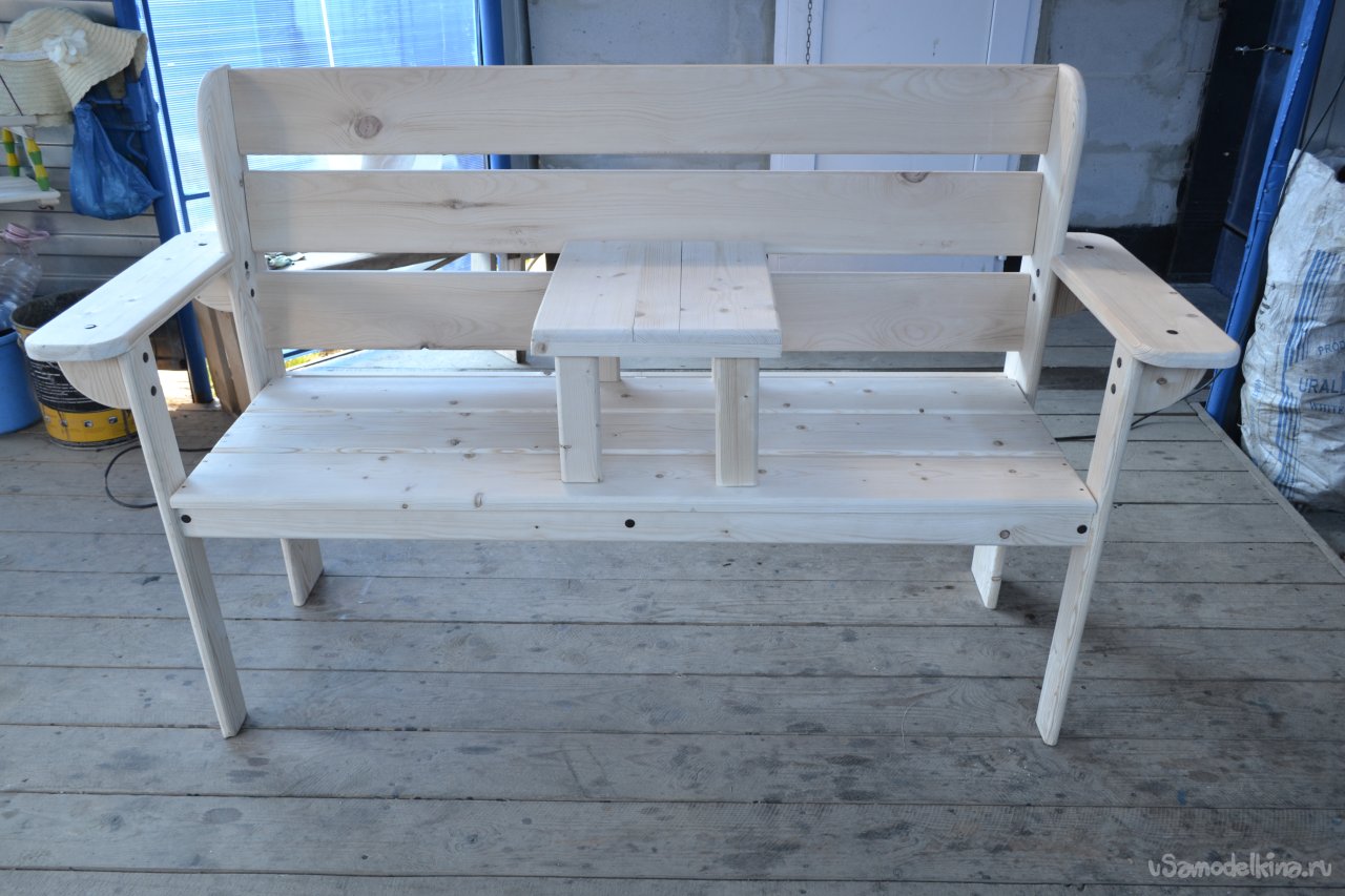Подлокотники – это не только элемент комфорта, но и важная деталь, придающая скамейке завершенный вид. Два отрезка досок длиной 550 мм были закреплены на боковых частях каркаса, между передними и задними ножками. Я расположил их так, чтобы они переходили от передней части ножки к задней. Для надежности крепления я использовал мебельные шурупы, которые обеспечивают прочное соединение и эстетичный внешний вид. Затем пришла мысль сделать съёмный столик, в итоге получилась вот такая конструкция. Это небольшой, но продуманный элемент добавил скамейке ещё больше практичности, превратив её в идеальное место для чаепития или чтения на свежем воздухе. Размеры все примерные.
