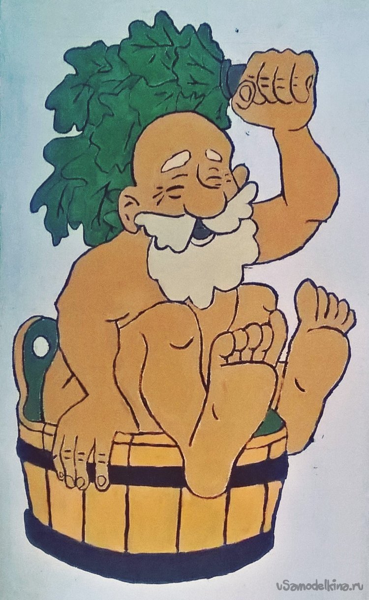 Когда основные цвета высохли, пришло время для тонкой работы — добавления мелких деталей, которые вдохнули жизнь в рисунок. На лице банщика появились лёгкие морщинки, придающие ему характер. Отдельные волоски в бороде и усах сделали их более реалистичными и объёмными. На бочке заиграли блики, имитирующие отражение света на влажном дереве. На листьях веника проявились тонкие прожилки, подчёркивающие их естественность. Для создания текстуры и объёма активно использовалась техника «сухой кисти», позволяющая добиться мягких переходов и легкой шероховатости.
