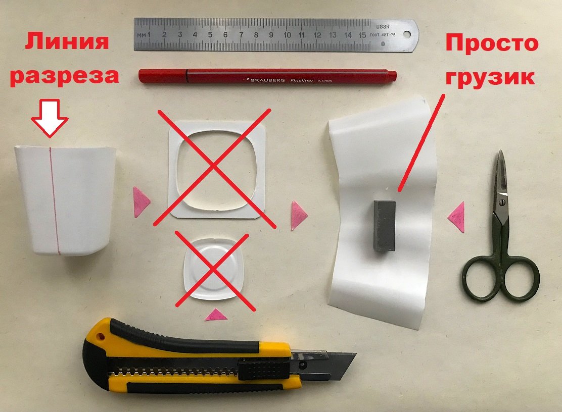 Для изготовления эластичного пластикового корпуса КЦМИ потребуется всего одна (из четырёх, скреплённых вместе) упаковок от йогурта. Для разделения четырёх упаковок, их достаточно 2 раза разломить пополам. При этом не стоит опасаться нарушения герметичности упаковки и громкого характерного («фирменного») хлопка, создающегося при разделении упаковок!