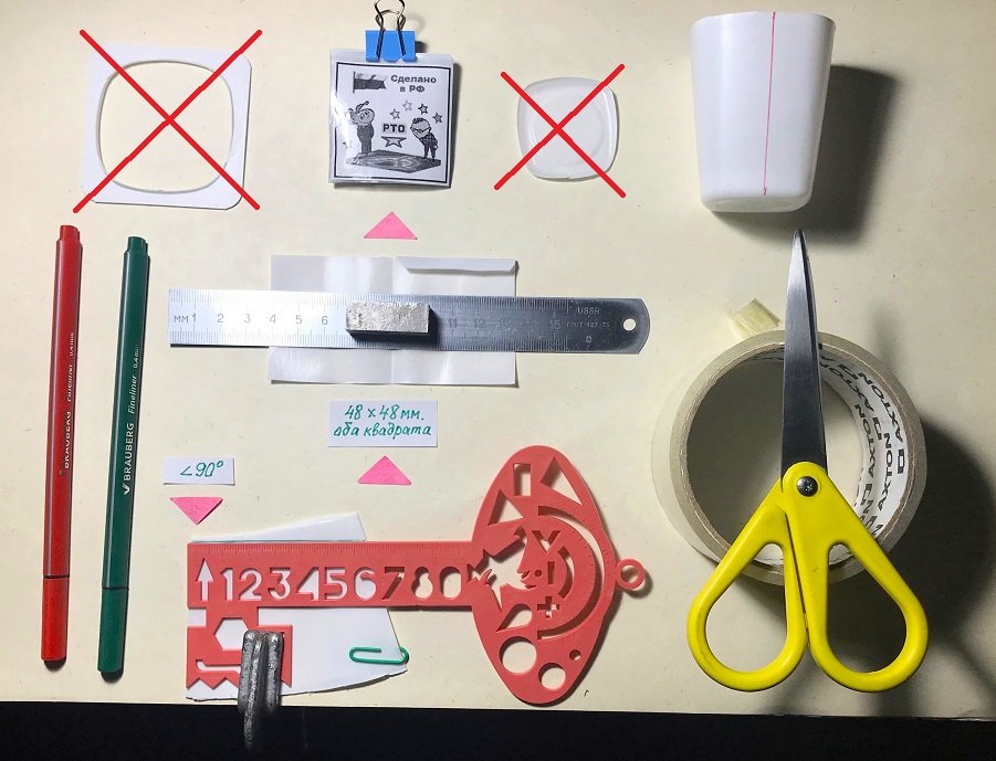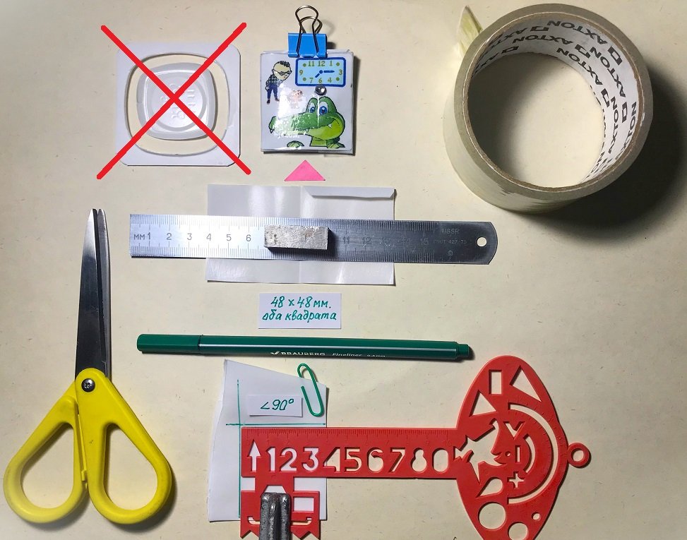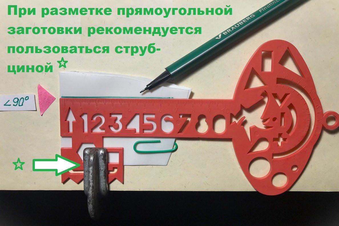 Перегибаем пластиковую заготовку пополам, зажимаем зелёной скрепкой и строим первый прямой угол (90⁰) на пластиковой заготовке. При разметке заготовки можно использовать капиллярную ручку, перманентный фломастер и даже простой карандаш. Линейку (трафарет или чертёжный угольник) перед проведением разметочной линии желательно закреплять струбциной. Это займёт (как покажется вначале) неоправданно большое время, зато получится ровный четырёхугольник.