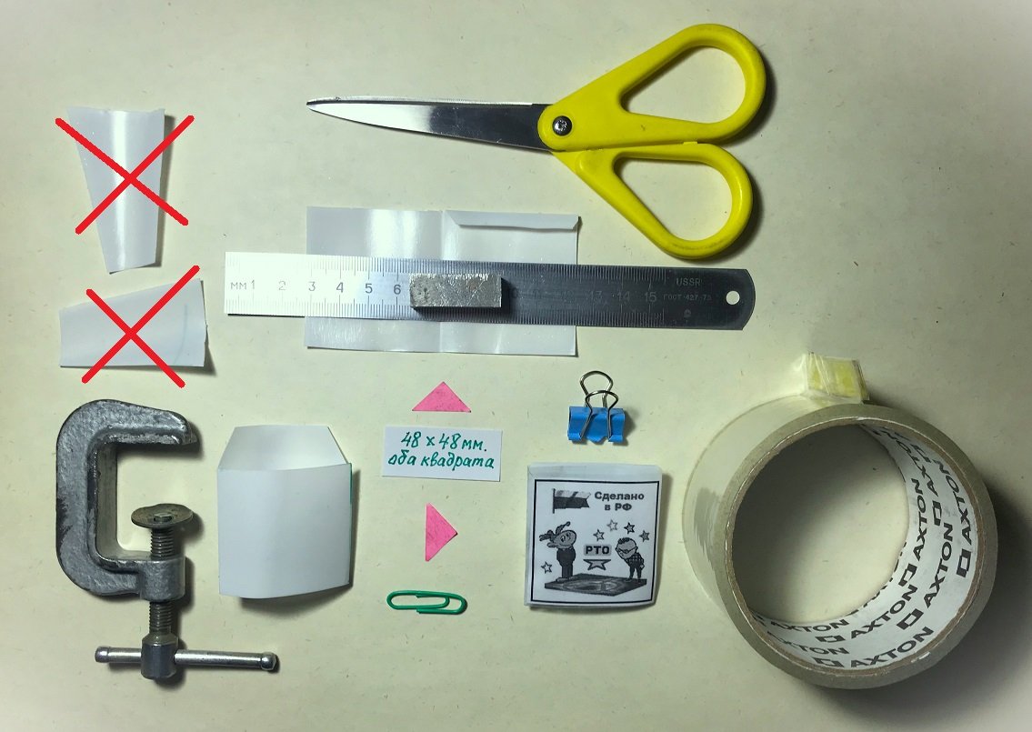Складываем заготовку как показано на рисунке 09. Следует обратить внимание, что, перегибая пластиковую заготовку, изгибы делается не «резкие», а плавные (во избежание растрескивания заготовки в месте изгиба). Проверено: при третьем перегибе заготовка обычно ломается. Далее проверяем размеры получившихся квадратов и ножницами придаём форму верхнему клапану.