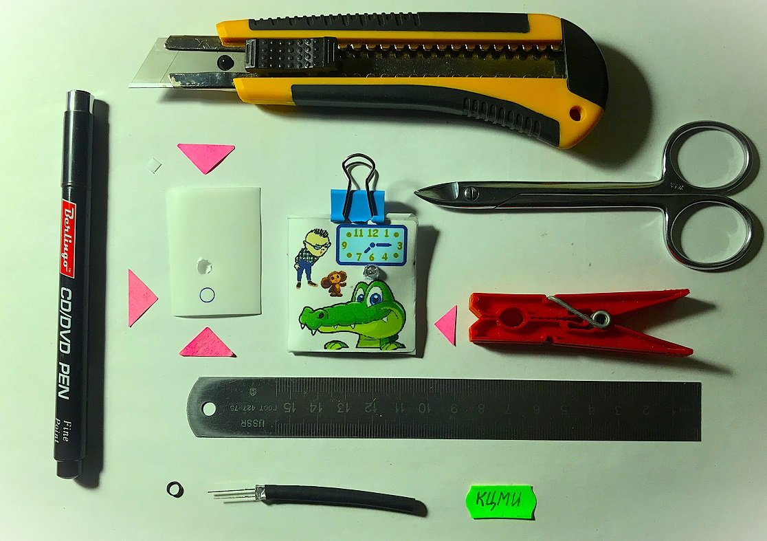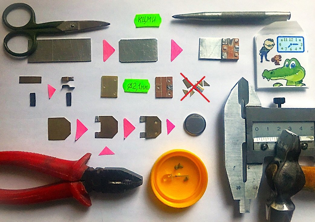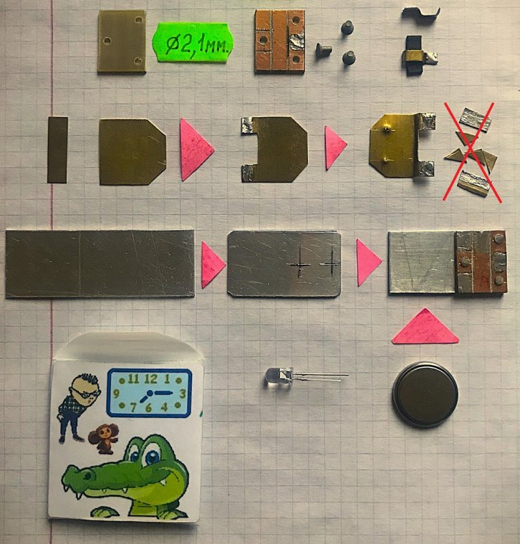 Приступаем к изготовлению внутренностей КЦМИ: основания, платы, кнопки и контакт-пружины. Сразу изготовить все детали не получится: работа кропотливая и требует нескольких подходов. Особую усидчивость придётся проявить при изготовлении кнопки.