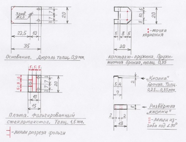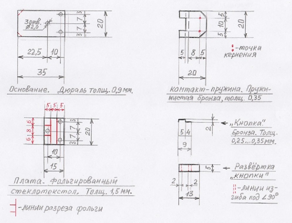 4). Кусочек пружинистой бронзы размерами 13 х 5 х 0,25 … 0,35 мм – для изготовления кнопки