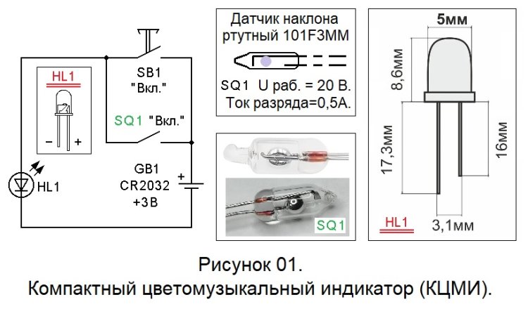 Схема КЦМИ содержит всего 3 детали промышленного изготовления и относится к разряду простейших. Однако интересное сочетание самодельного кнопочного включателя и миниатюрного ртутного датчика наклона позволяют придать индикатору новую потребительскую опцию. А наличие 5 - миллиметровой детали SF-LED «Перелив» со встроенным контроллером, позволяет обойтись без многоэлементной схемы цветомузыки на дискретных элементах.