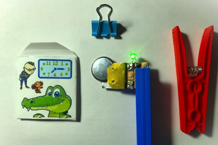1). Нажать и удерживать в нажатом положении пальцем (или бельевой прищепкой) кнопку SA1. 2). Взять КЦМИ в руки (при этом индикатор, как правило, выводится из горизонтального положения). 3). Случайно (или целенаправленно) задеть или толкнуть КЦМИ. При этом (в зависимости от силы воздействия) будет несколько миганий HL1 красным цветом. КЦМИ как бы напоминает о своём существовании и напоминает: если включить его и забыть во включённом состоянии, то через несколько десятков часов придётся покупать новую батарейку.