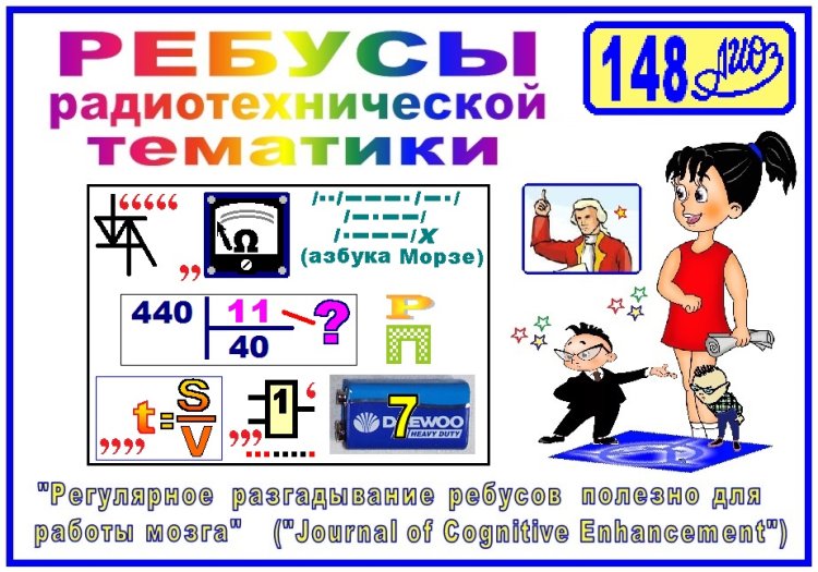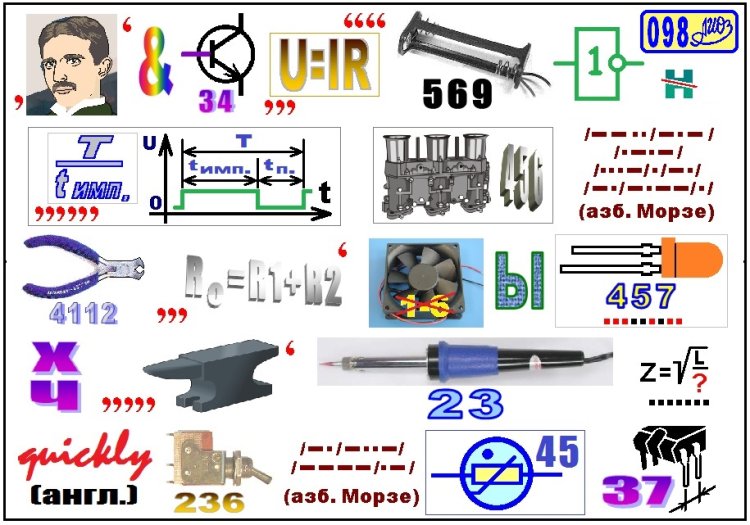 Ребус РРТ № 098 из статьи ДУФ2 (Дистанционно управляемый фонарик – 2). Ответ: Если заряжать не полностью разряженные аккумуляторы, то их начальная ёмкость быстро уменьшается [Тесла, и, база(34), напряжение, держатель(569) НЕ(инвертор), пол «н» (половина буквы «н»), скважность, карбюратор(456), зряженные(азбука Морзе), кусачки(4112), формула (последовательного соединения резисторов), вентилятор, ы, светодиод(457), «х» на «ч», наковальня, паяльник(23), ёмкость (в формуле волнового сопротивления фидера), быстро(quickly), тумблер(236), ньша(азбука Морзе), бареттер(45), расстояние(37), или «шаг»].