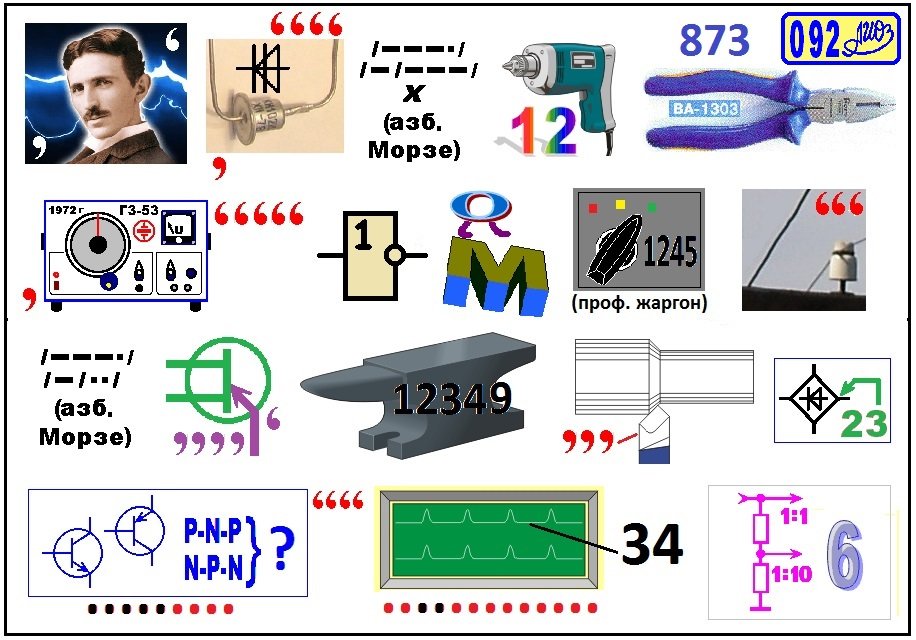 Ответ: Если ничто другое не помогает, прочтите, наконец, инструкцию. [Тесла, динистор, что(азбука Морзе), дрель(12), плоскогубцы(873), генератор, НЕ(инвертор), по «м» «о»(идёт), галетник(1245), провод, чти(азбука Морзе), эмиттер, наковальня(12349), резец, минус(23), структура, осциллограмма(34), аттенюатор(6)].