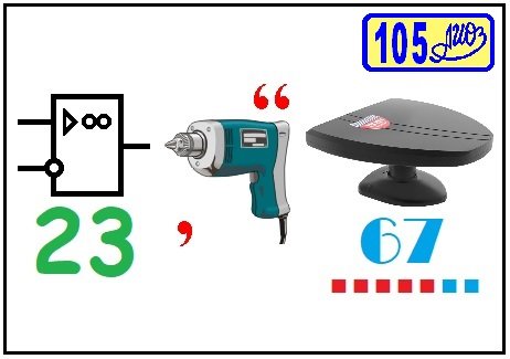 Ребус РРТ № 105 из статьи СДК (Сирена для Кена). Ответ: сирена [усилитель(23), дрель, антенна(67)].