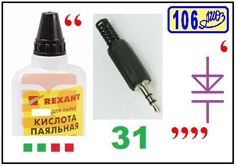 Ребус РРТ № 106 из статьи ПдФ (Проигрыватель для флешки). Ответ: флешка [флюс, штекер(31), варикап].
