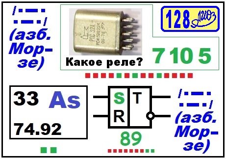 Ребус РРТ № 128 из статьи МЦПД (Музыкальный центр повышенной долговечности). Ответ: «Зарядка» [кавычки(азбука Морзе), поляризованное(7 10 5), яд (мышьяк), установка(89), кавычки(азбука Морзе)].
