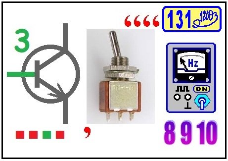 Ребус РРТ № 131 из статьи МЦИРА (Музыкальный центр с индикатором разряда аккумулятора). Ответ: зуммер [база(3), тумблер, частотомер(8 9 10)].