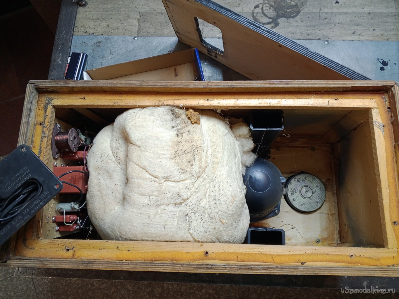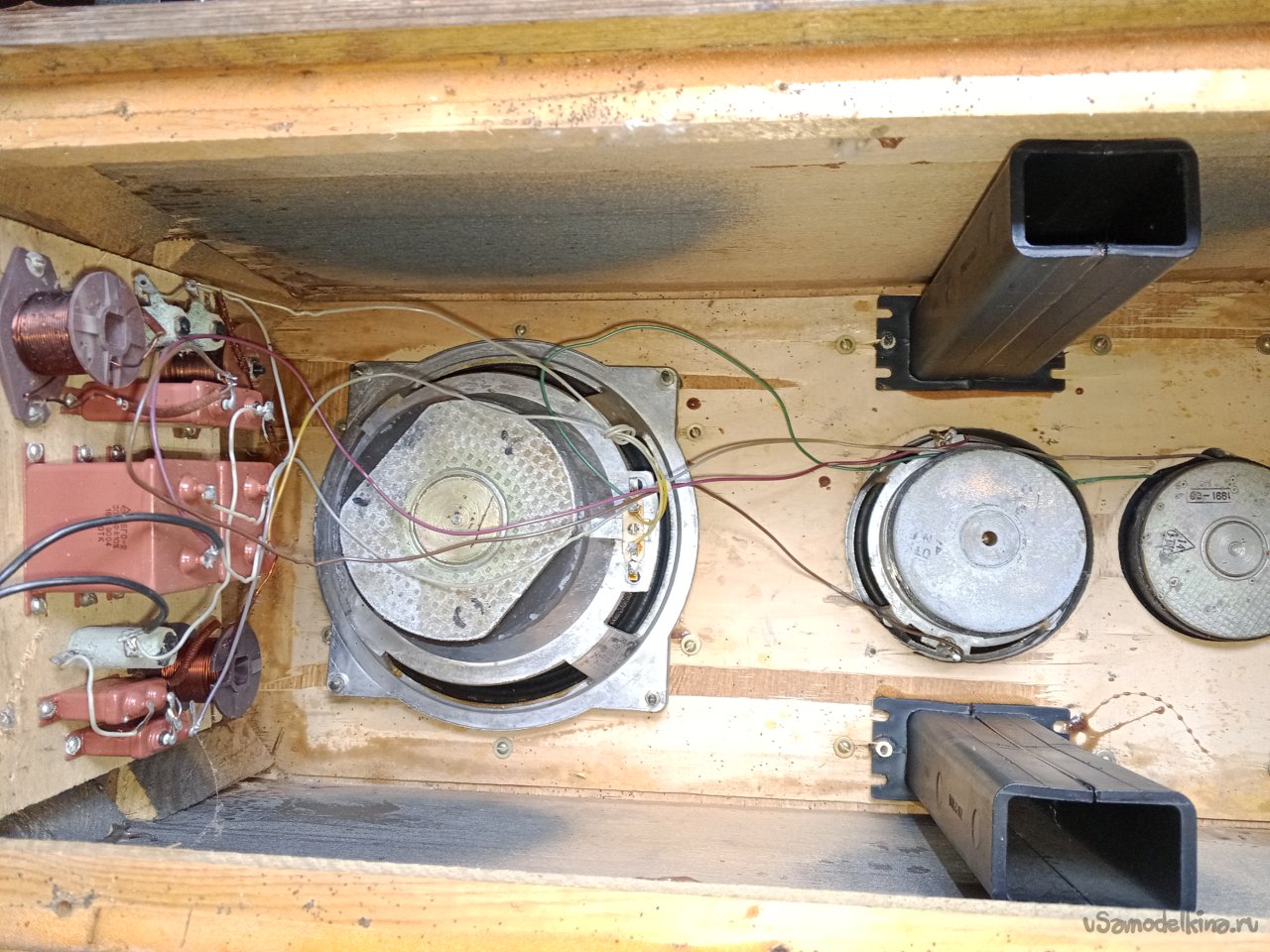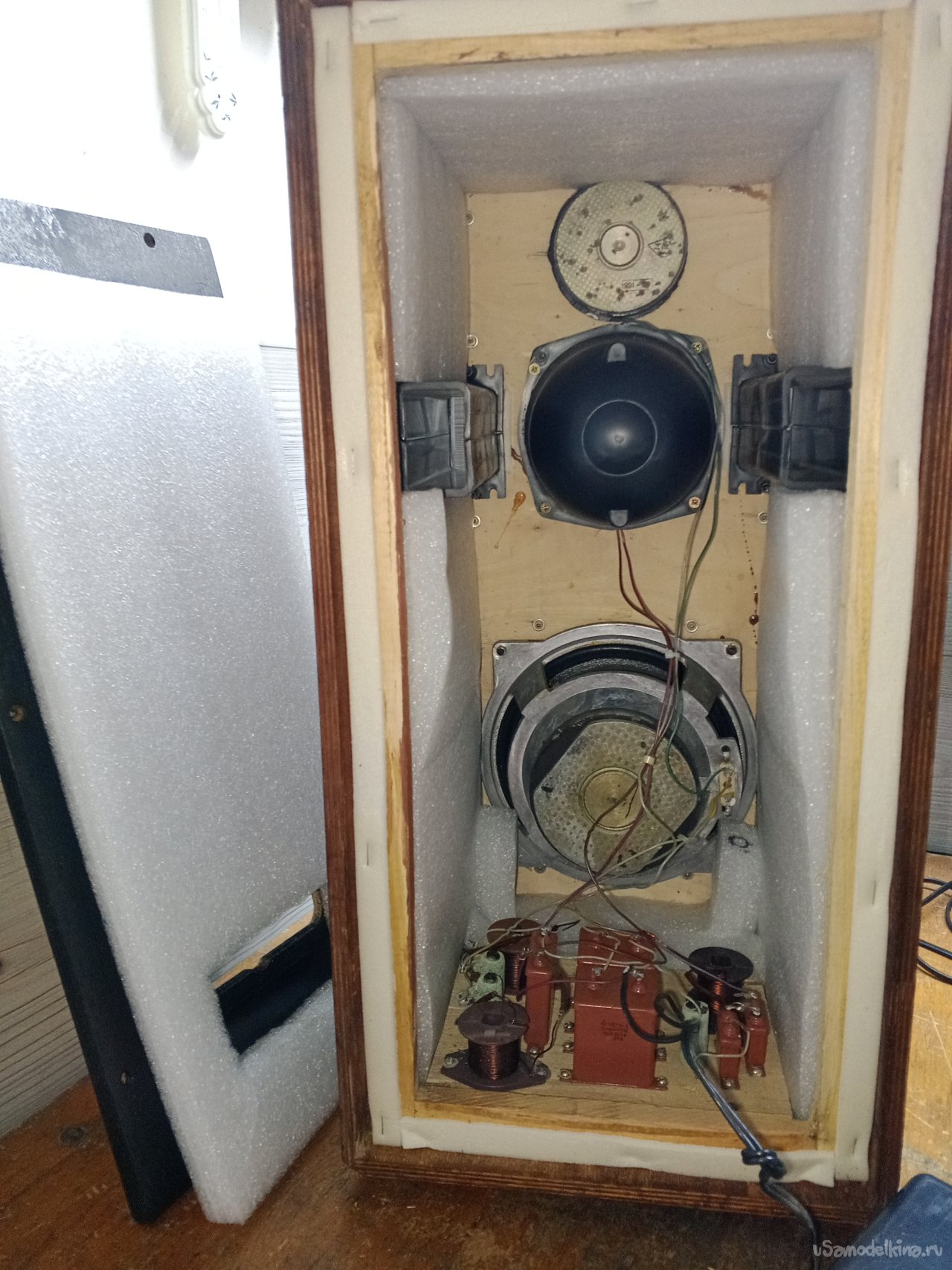 После снятия задней стенки, взору моему предстало «гнездо» из технической ваты, завернутой в марлю. Из живности никто на меня не выпрыгнул, останков от них не было, хотя следы присутствия насекомых, да еще в таком «гнезде», были. Оказалось раньше, для демпфировании акустики, применяли такую технологию. Еще внутри корпуса располагались - конденсаторный блок с катушками, собранный на толстой фанере, 3 разно частотных динамика, фазоинверторы, глухой колпак динамика средних частот, крепежные шпильки с гайками, распайка, и склейка корпуса. На всех деталях стоит клеймо 1991 года и ОТК завода. Визуально все выглядело целым.
