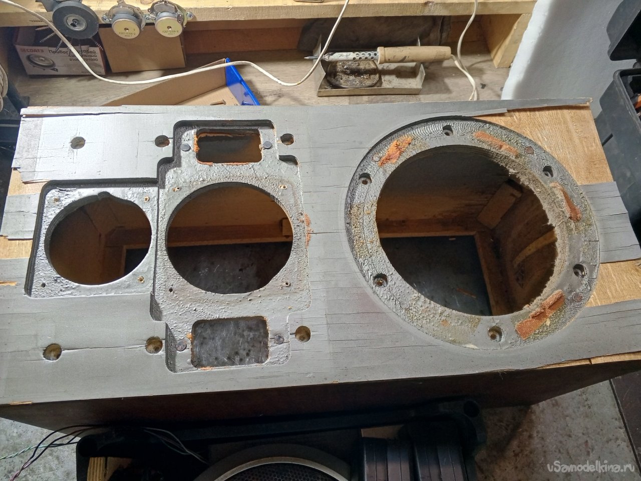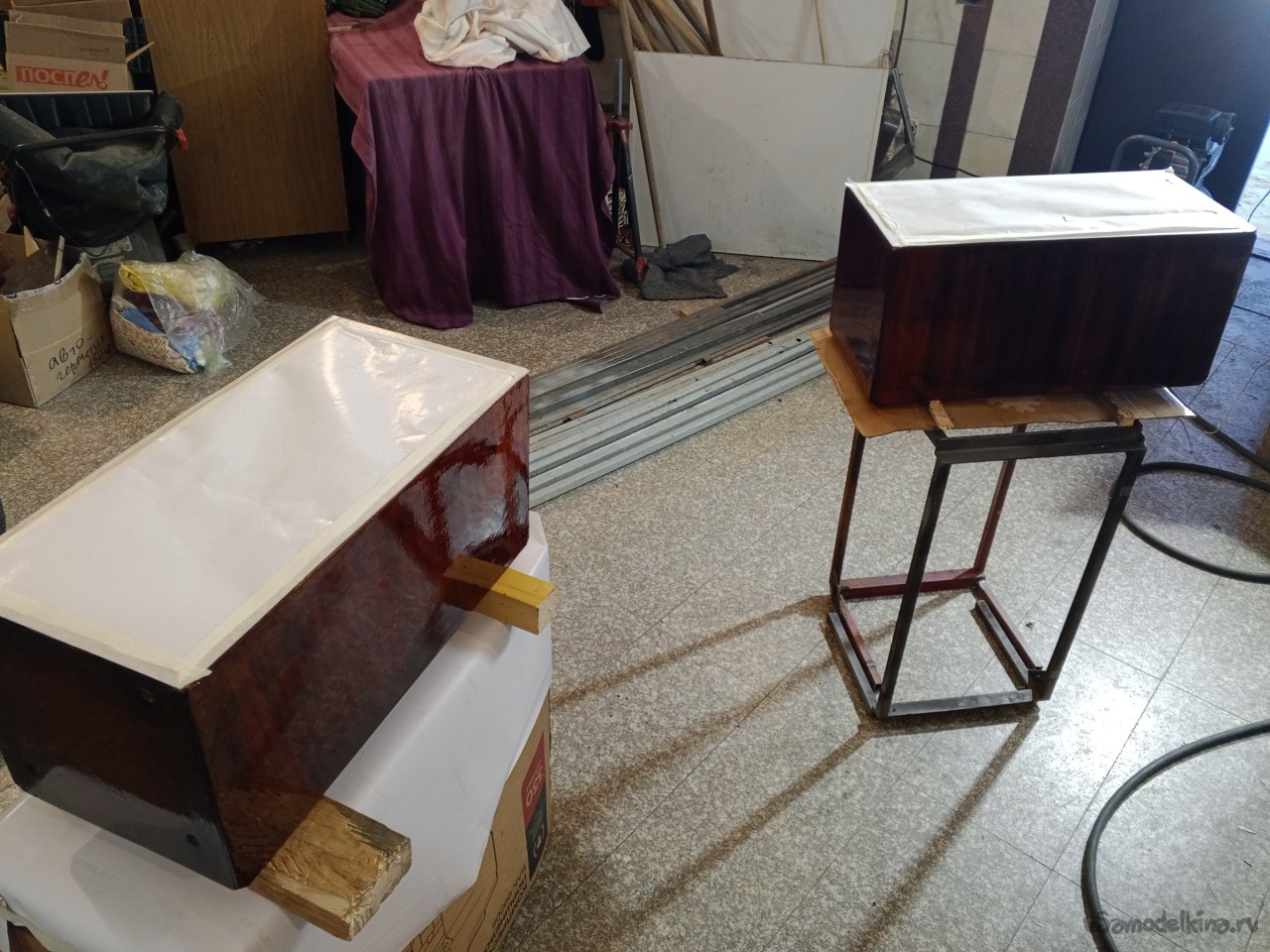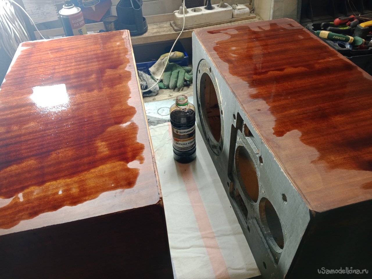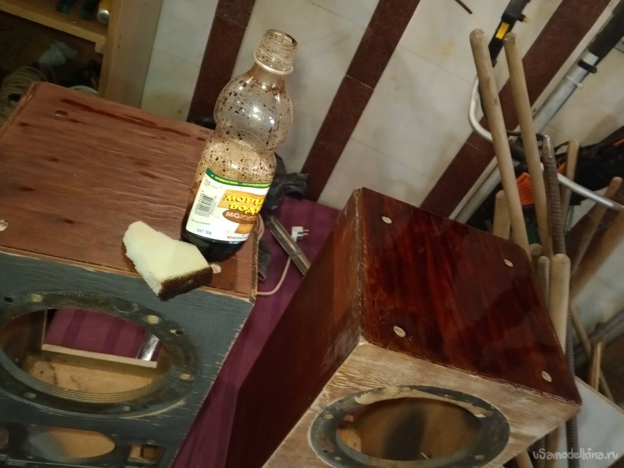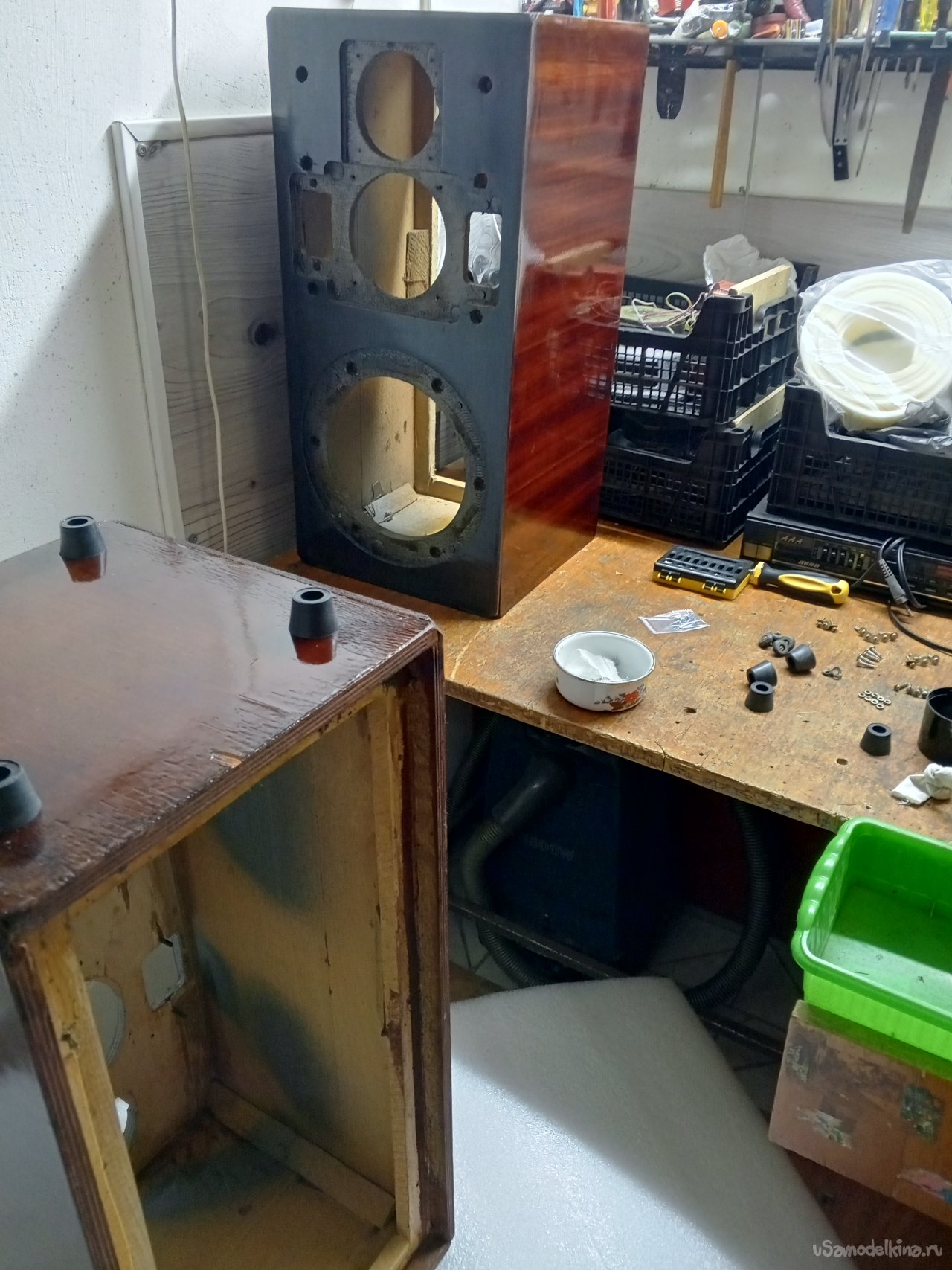 Деревянные корпуса колонок, в принципе оказались крепкими и в местах склейки стенок были целыми. Передние крашеные стенки, от времени пострадали больше. От влаги, верхний слой шпона, в некоторых местах, вздулся и отошел от основных слоев фанеры, а где-то и фанера расслоилась.