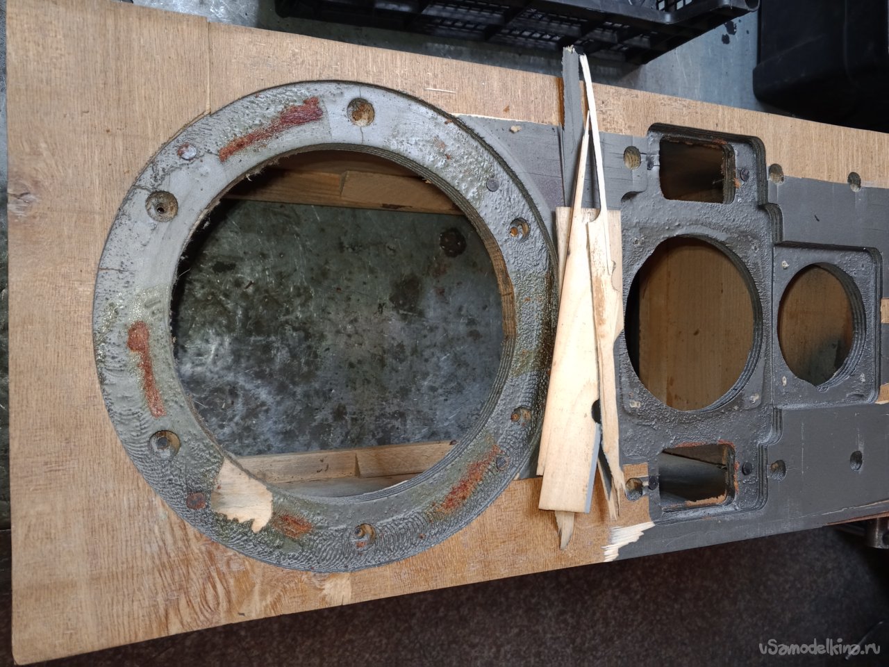 Полости вздутых частей фанерного корпуса, заливал столярным клеем и через прокладки зажимал струбцинами, для выравнивания.