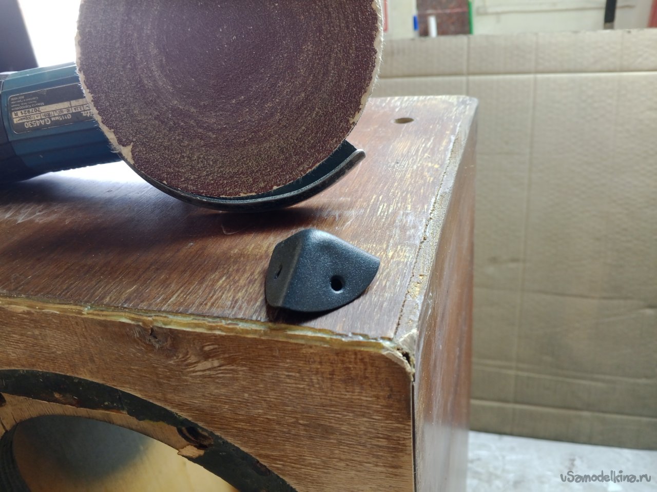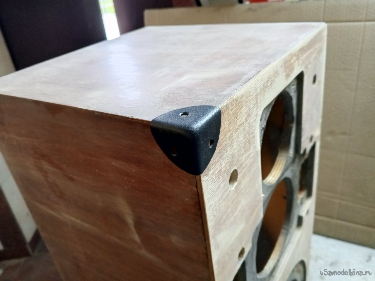 Решил укрепить (защитить) углы корпуса колонок металлическими уголками, поэтому заранее подготовил для них посадочные места, а именно, сточил фанеру на углах, для лучшего прилегания.
