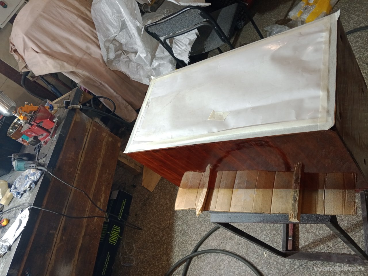 Верхний слой шпона, передних стенок колонок, решил удалить совсем, благо клей высох от времени и куски, по волокнам, отделялись хорошо.