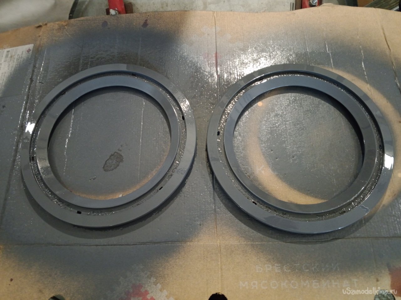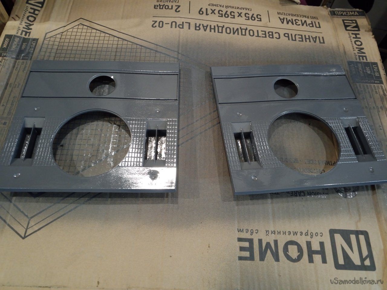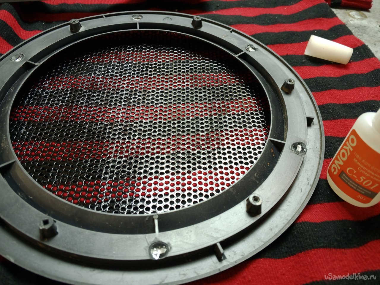 Сборку колонок начал с установки новых ножек, приобрел в магазине радиодеталей каучуковые, повыше и побольше тех, которые были. Далее собрал декоративные накладки, «посадив» их на клей типа «Дихлорэтан», а металлические решетки вдавил через термоклей. Дюралька «встала» без проблем, «усики» не лопнули, выдержали очередной загиб. Остальные детали, поочередно размещались на свои места. По заводскому принципу, фазоинверторы установил, наклеив на них оконный самоклеящийся утеплитель из пенополиэтилена, поролоновый не нашел. Его же использовал как внутренности колпаков для средних динамиков. Когда установил все динамики на первой колонке, понял, что серые картонные их диффузоры, абсолютно не смотрятся на фоне всего вновь окрашенного. Так как «хром» еще остался, закрасил диффузоры на месте, а для второй колонки заранее. Окончательно собрал все детали колонок, но пока без задних стенок. По мне, так получилось просто отлично.