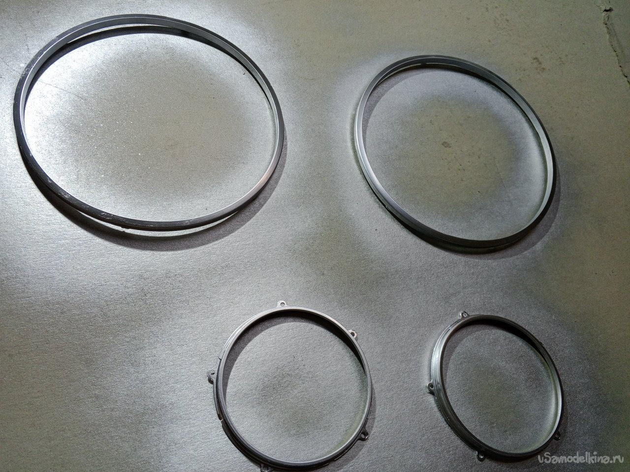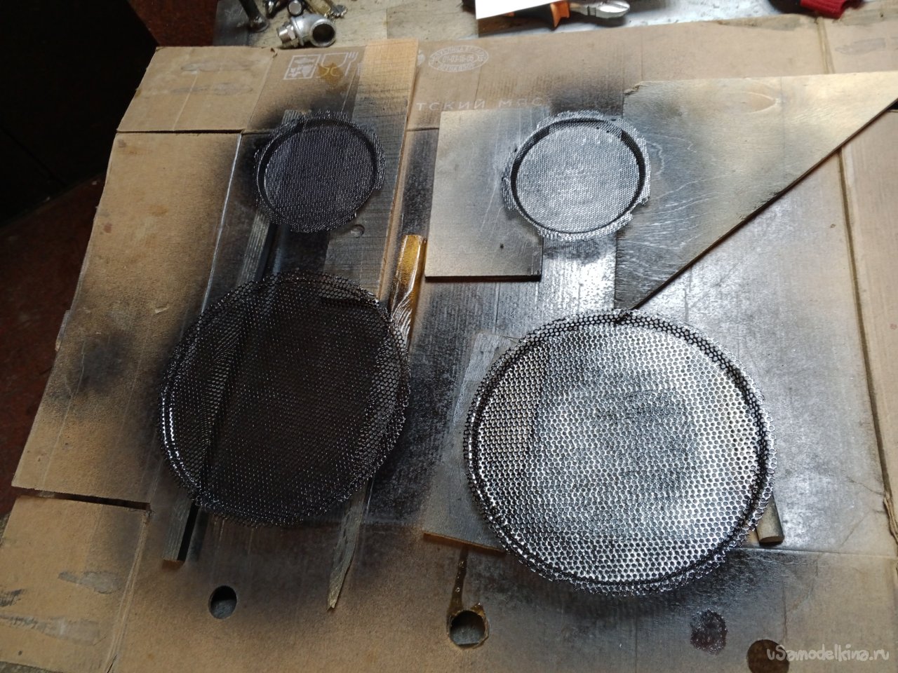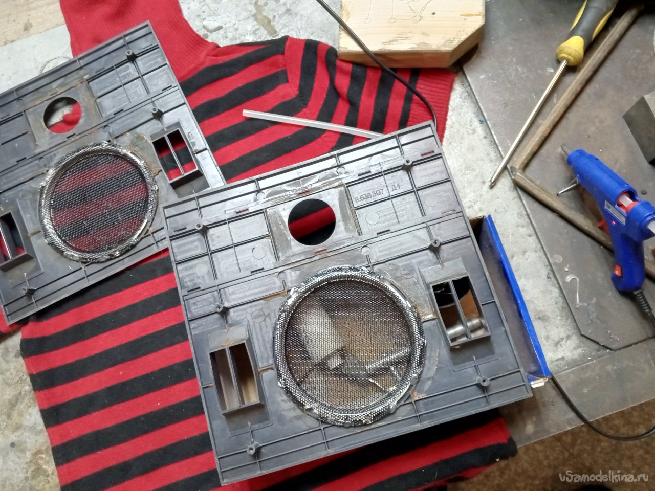 Сборку колонок начал с установки новых ножек, приобрел в магазине радиодеталей каучуковые, повыше и побольше тех, которые были. Далее собрал декоративные накладки, «посадив» их на клей типа «Дихлорэтан», а металлические решетки вдавил через термоклей. Дюралька «встала» без проблем, «усики» не лопнули, выдержали очередной загиб. Остальные детали, поочередно размещались на свои места. По заводскому принципу, фазоинверторы установил, наклеив на них оконный самоклеящийся утеплитель из пенополиэтилена, поролоновый не нашел. Его же использовал как внутренности колпаков для средних динамиков. Когда установил все динамики на первой колонке, понял, что серые картонные их диффузоры, абсолютно не смотрятся на фоне всего вновь окрашенного. Так как «хром» еще остался, закрасил диффузоры на месте, а для второй колонки заранее. Окончательно собрал все детали колонок, но пока без задних стенок. По мне, так получилось просто отлично.