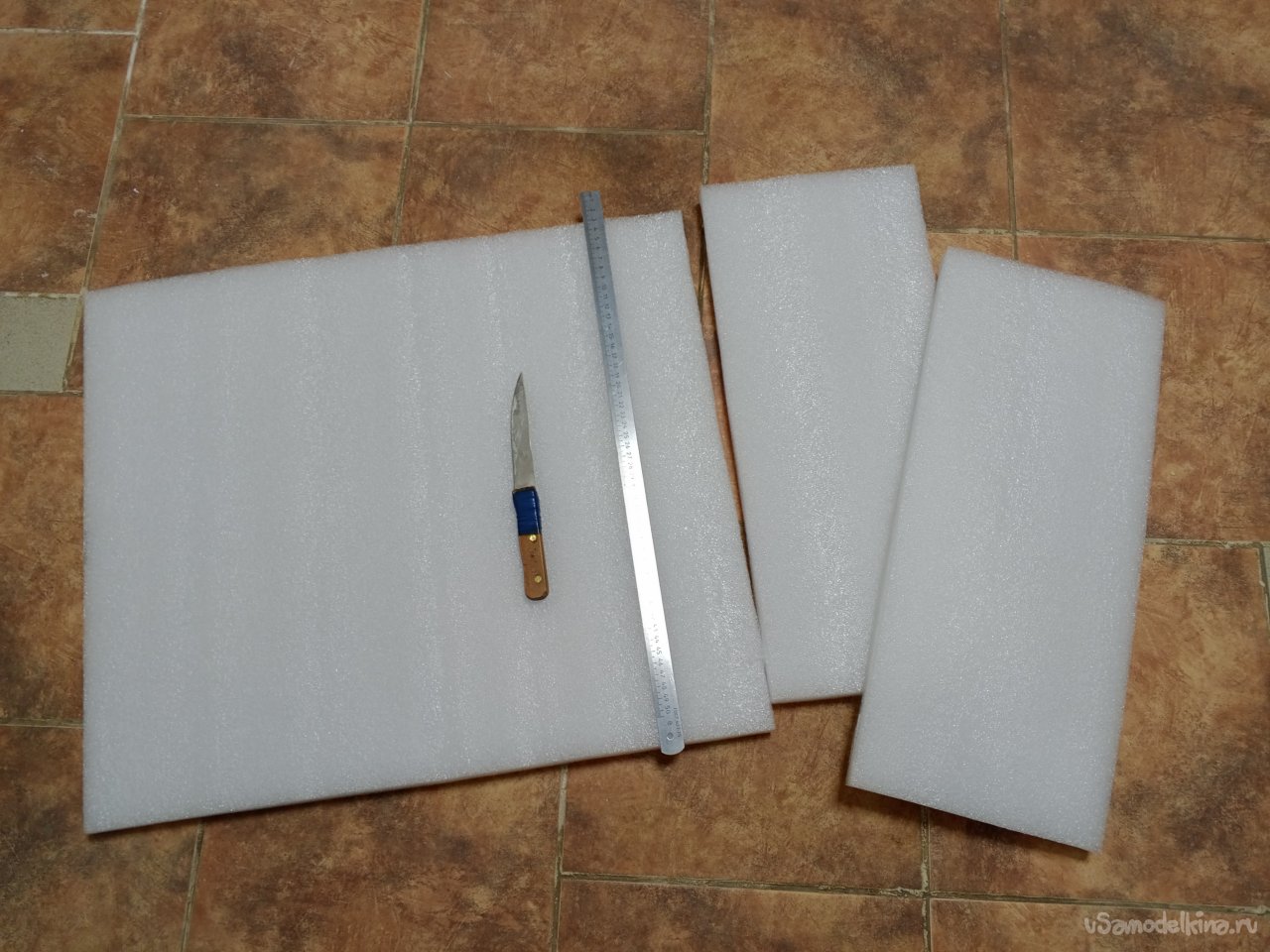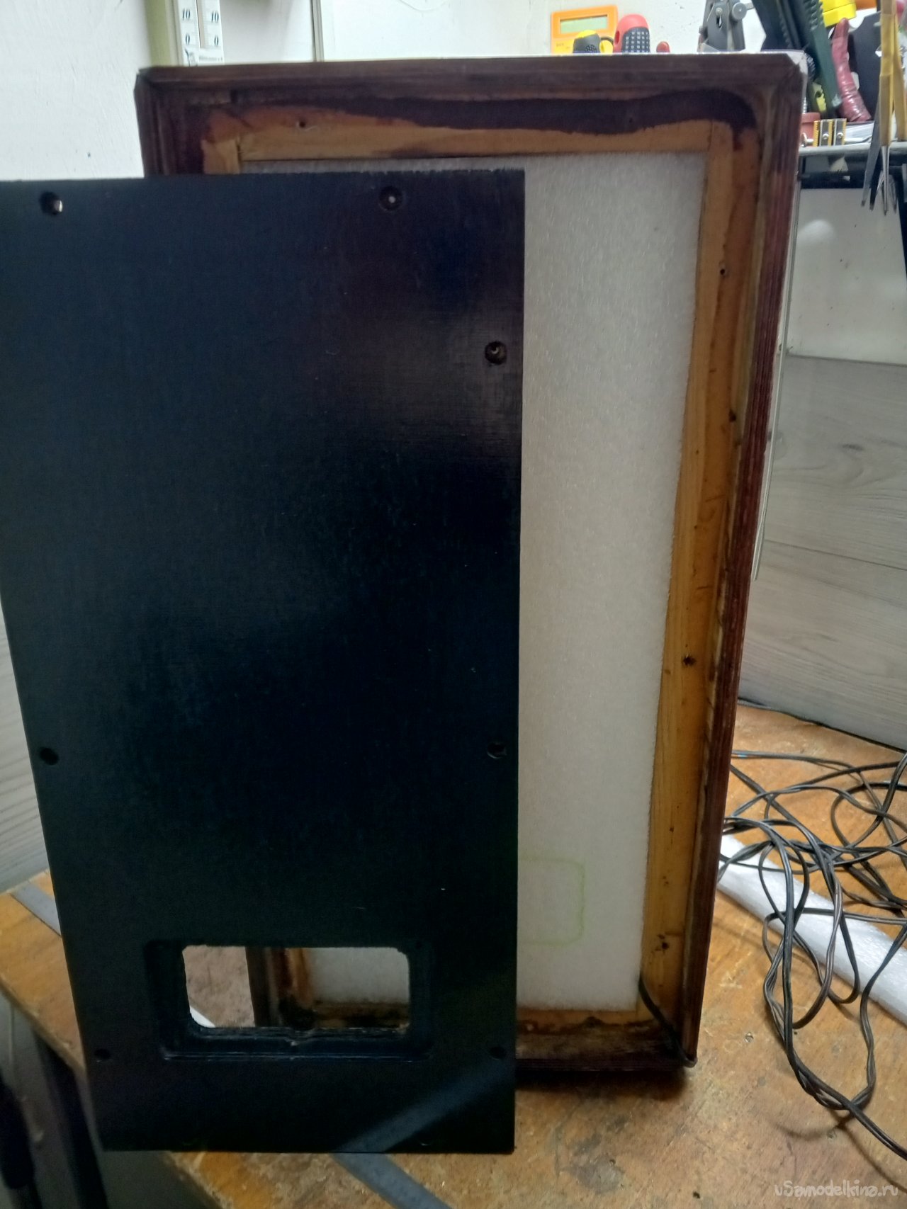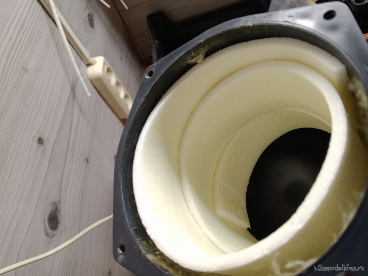 В хозяйственном магазине приобрел листы утеплителя, из вспененного капрона, толщиной 30мм. Нарезал заготовки и вставил их в распор, внутри корпуса колонок. Получилось так, что, когда прикрутится задняя стенка, все «пенки» будут держать друг друга. Установил заднюю стенку, притянув ее наклеив оконный уплотнитель, установил фланец с подключающими проводами.