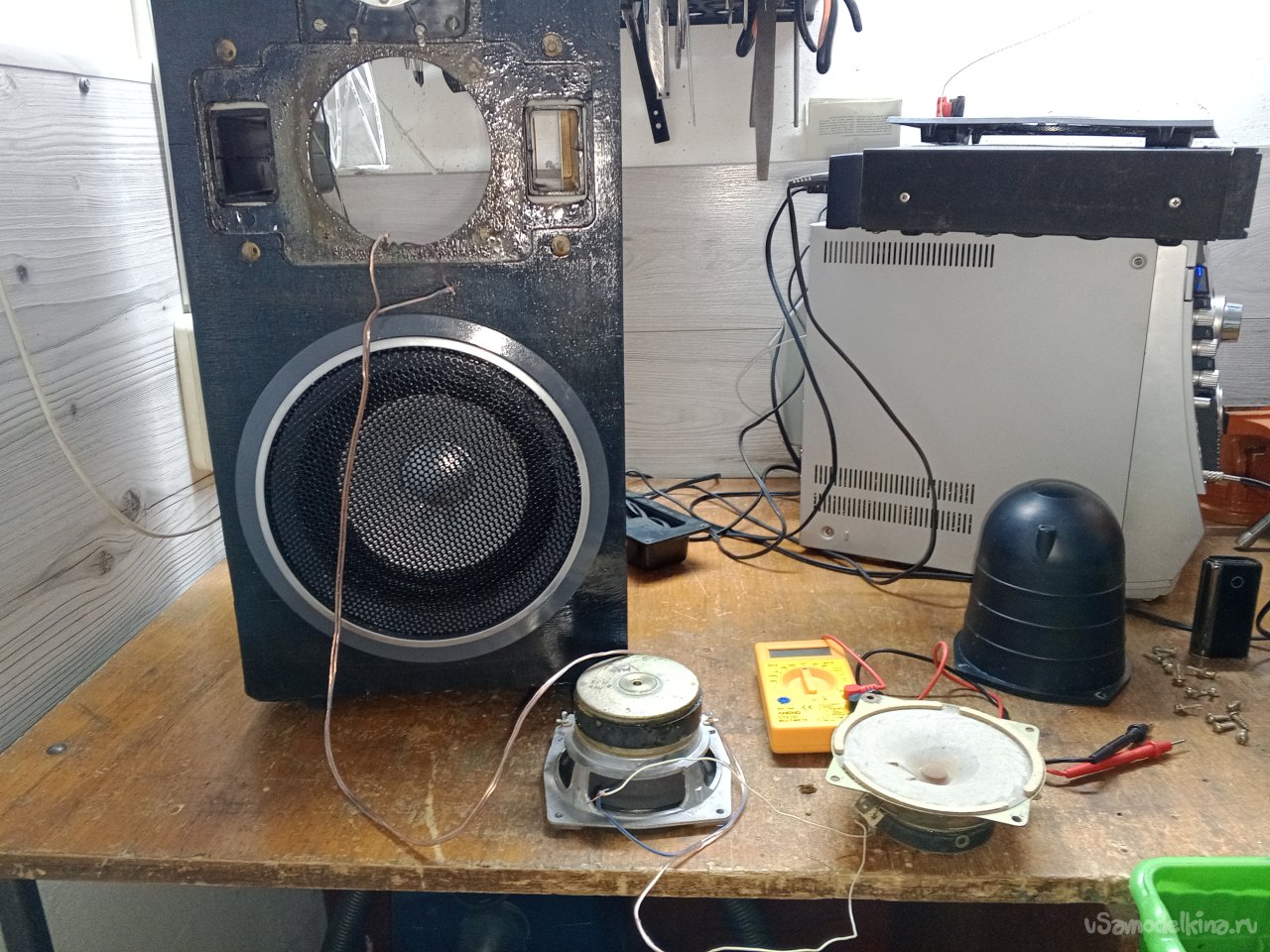 Ну вот практически все собрано! Подключил через усилок, для проверки – «поют» громко, низы «бумкают», ни что не «пукает», но как будь то не то, нет баланса. Начал разбираться – не работает средний динамик на одной из колонок… Демонтировал, проверил, канал – работает. Динамик прозваниваю – по нулям. Ну думаю, катушка сгорела,