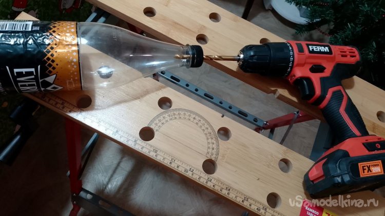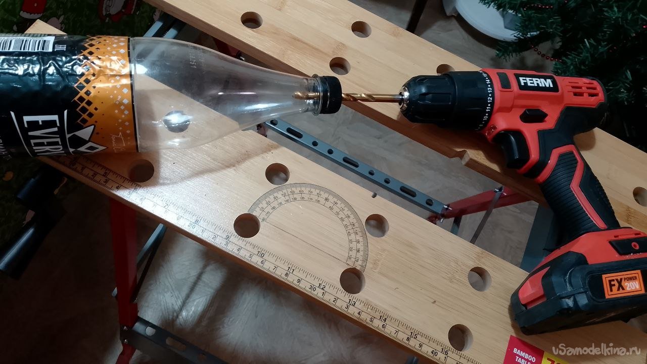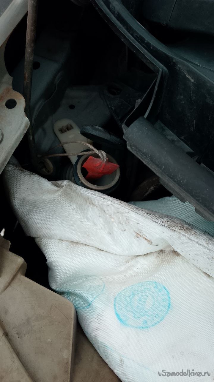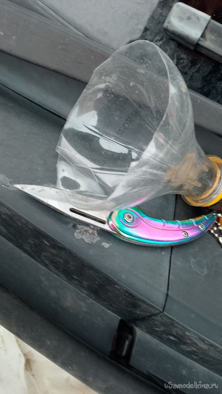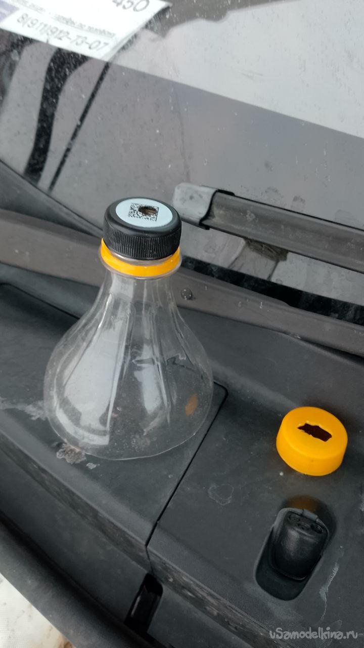 Отрезаем ножом лишнее и проделываем им же отверстие в пробке для ограничения скорости утекания жидкости. После испытаний возникло стойкое убеждение в необходимости уменьшить сечение отверстия. Для этого используем новую пробку, шуруповёрт и сверло подходящего диаметра. Удивительно, но резьбовая часть устройства вместе с гибким греющим элементом (находится внутри бачка омывателя на случай замерзания жидкости) плотно села на своё место. Пришлось немного подрезать изделие, чтобы его можно было вообще не снимать/ставить.