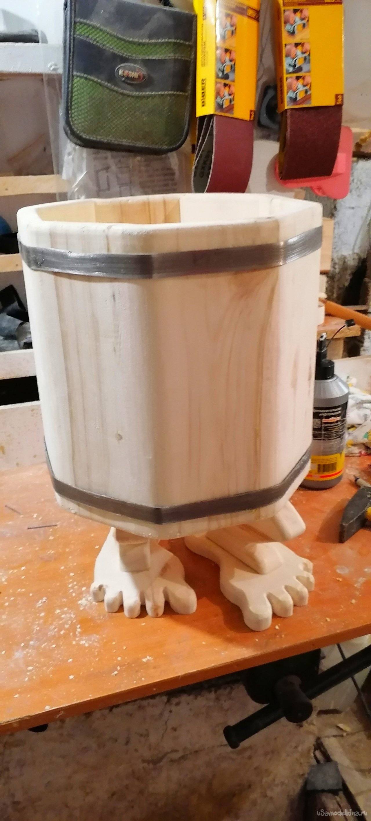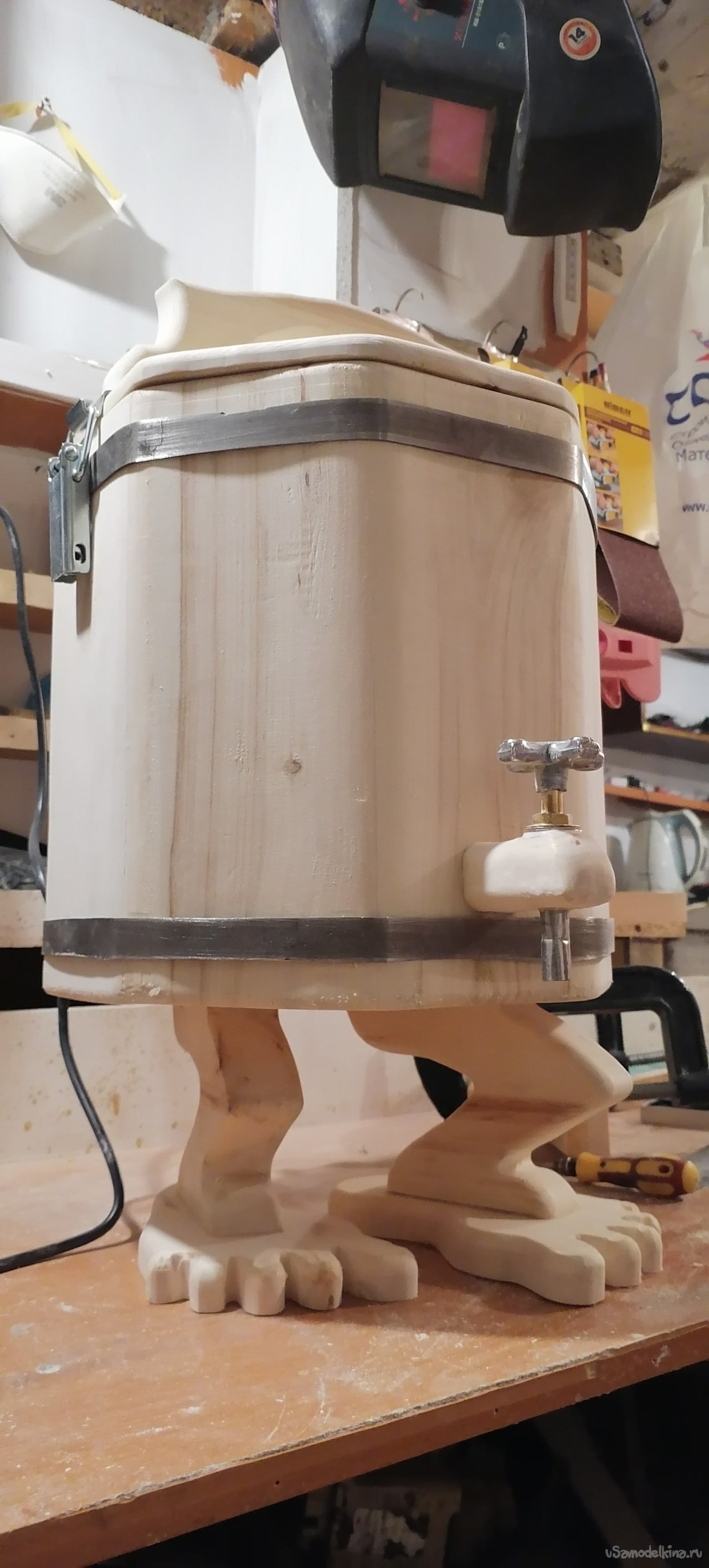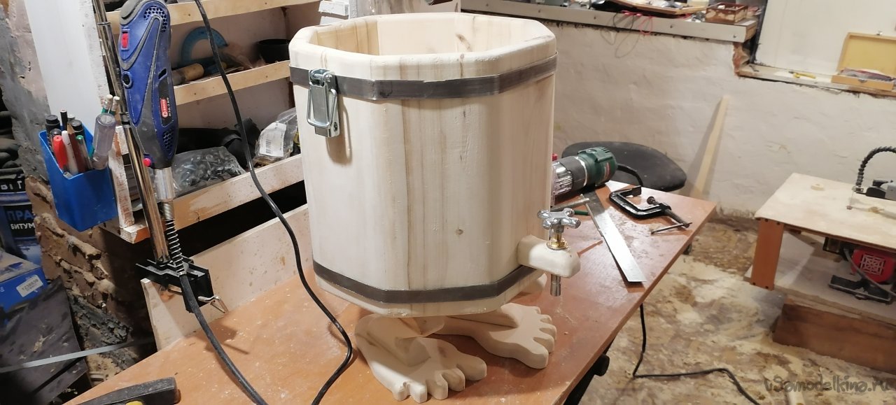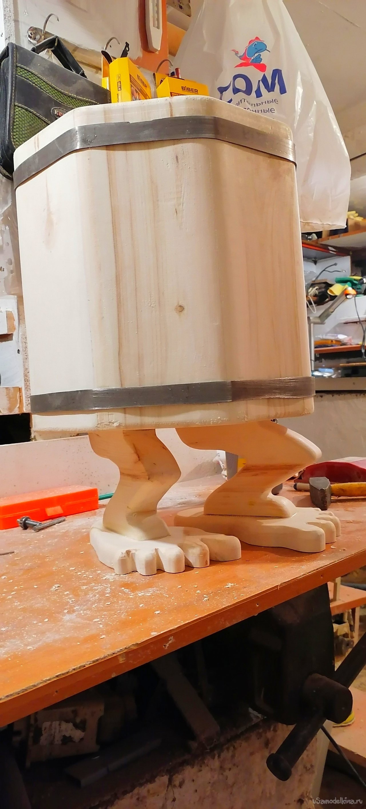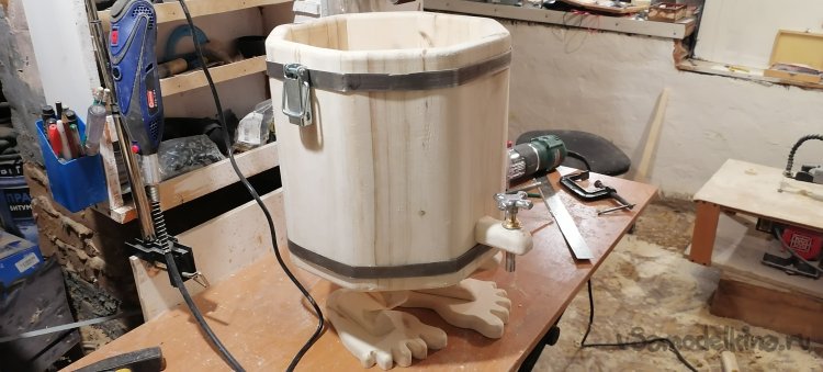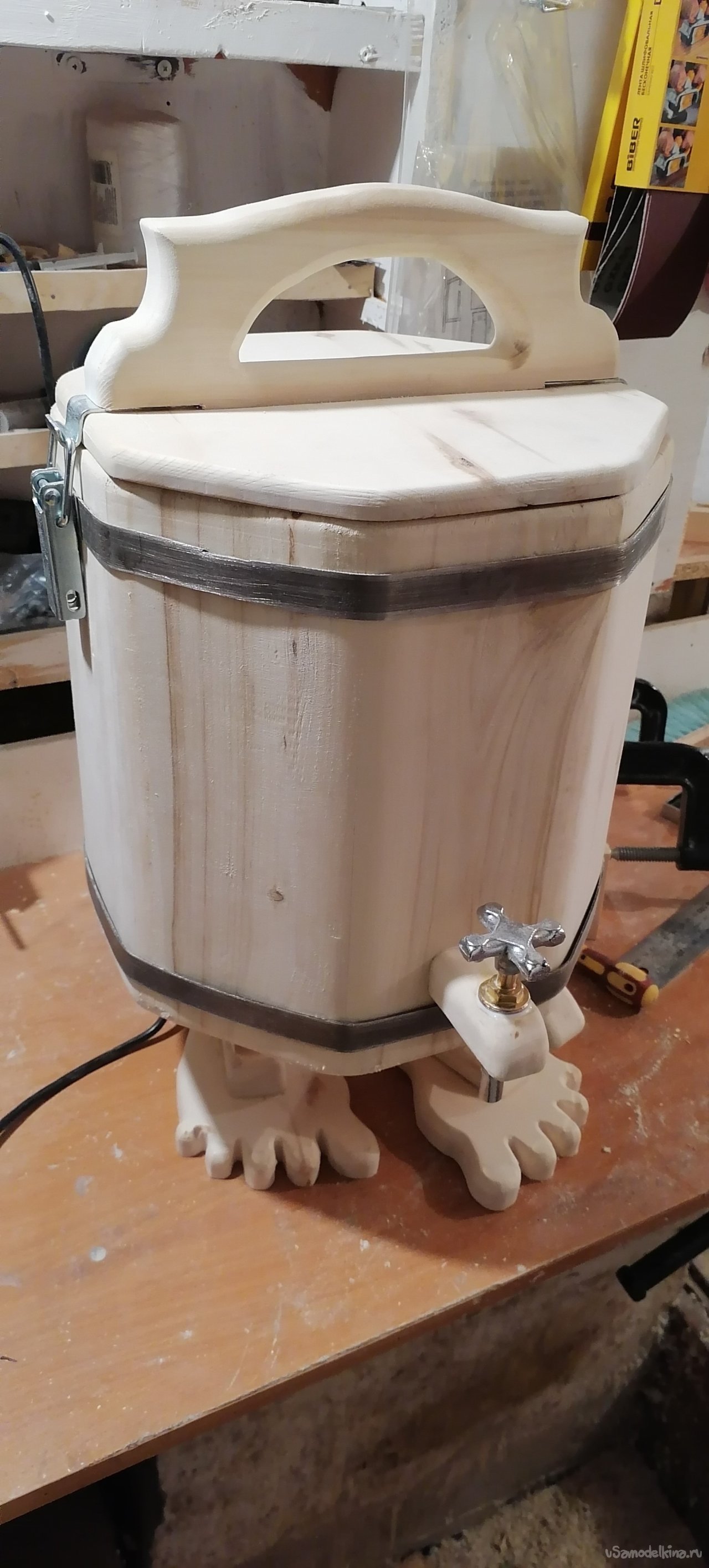 Но моему запарнику не хватало "изюминки". Я решил придать ему оригинальный вид, сделав ножки в виде стилизованных лап. Это придало ему некую "живость", будто он вот-вот оживет и начнет танцевать. Ножки я тоже вырезал из дерева, тщательно обрабатывая их, чтобы они были прочными и устойчивыми.